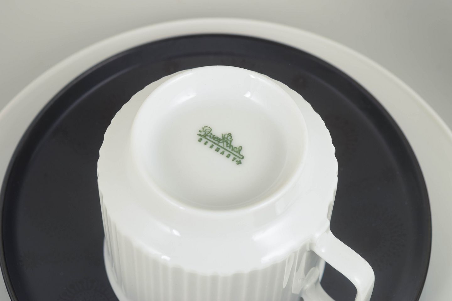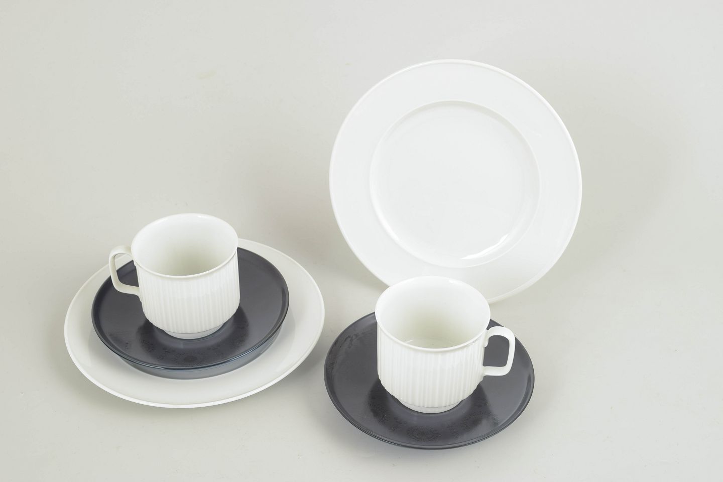 Tapio Wirkkala for Rosenthal, set of two coffee cups with matching saucers and cake plates.Set comprising two coffee cups in white porcelain with a distinctive fluted surface, each with a matching saucer in a contrasting glaze, accompanied by two matching cake plates. A restrained and functional design with a clear Nordic modernist expression.
