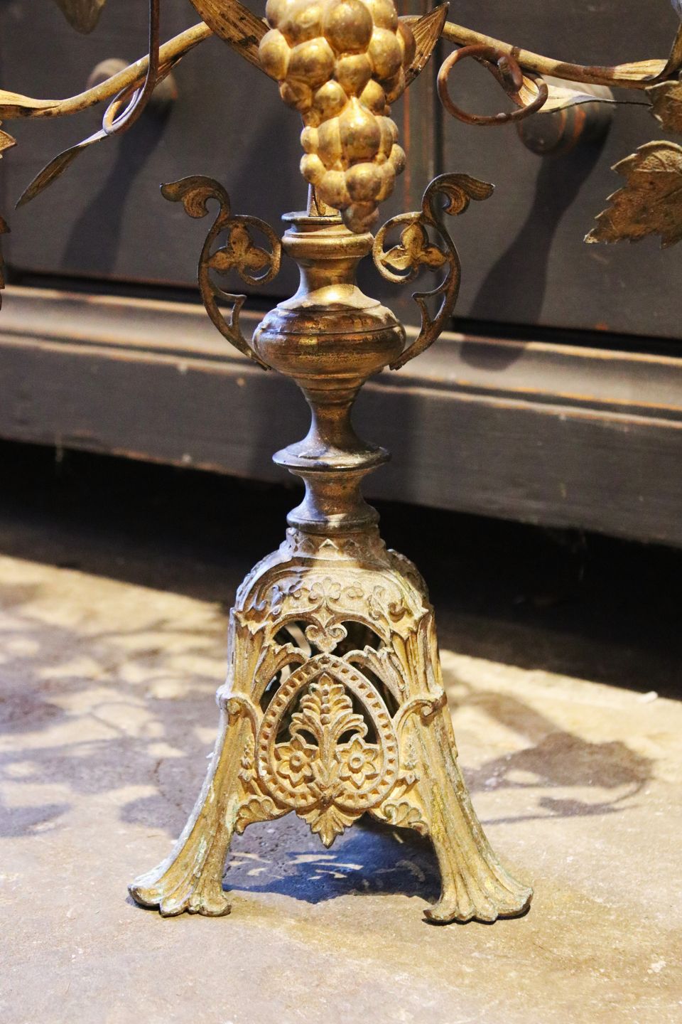 We offer a wide selection of old furniture with character, prism chandeliers and French church candlesticks.
