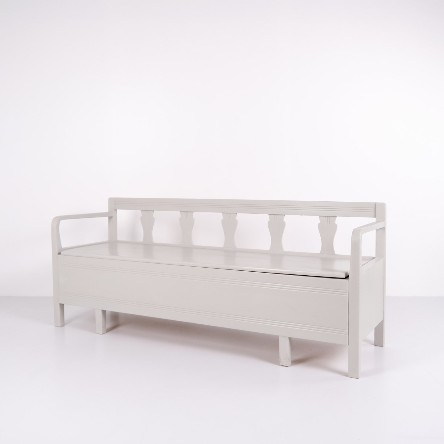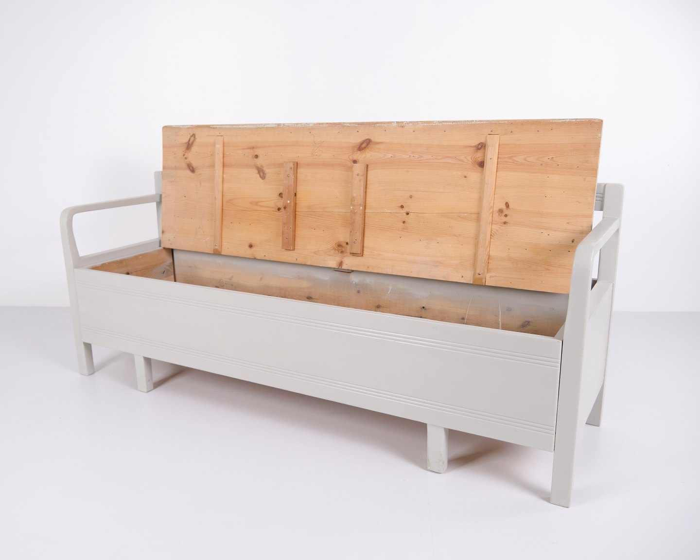 Antique beater bench from the 1860s in gray painted pine. Classic folk design with seating and storage. Historical and functional furniture.— Origin: Denmark / Scandinavia