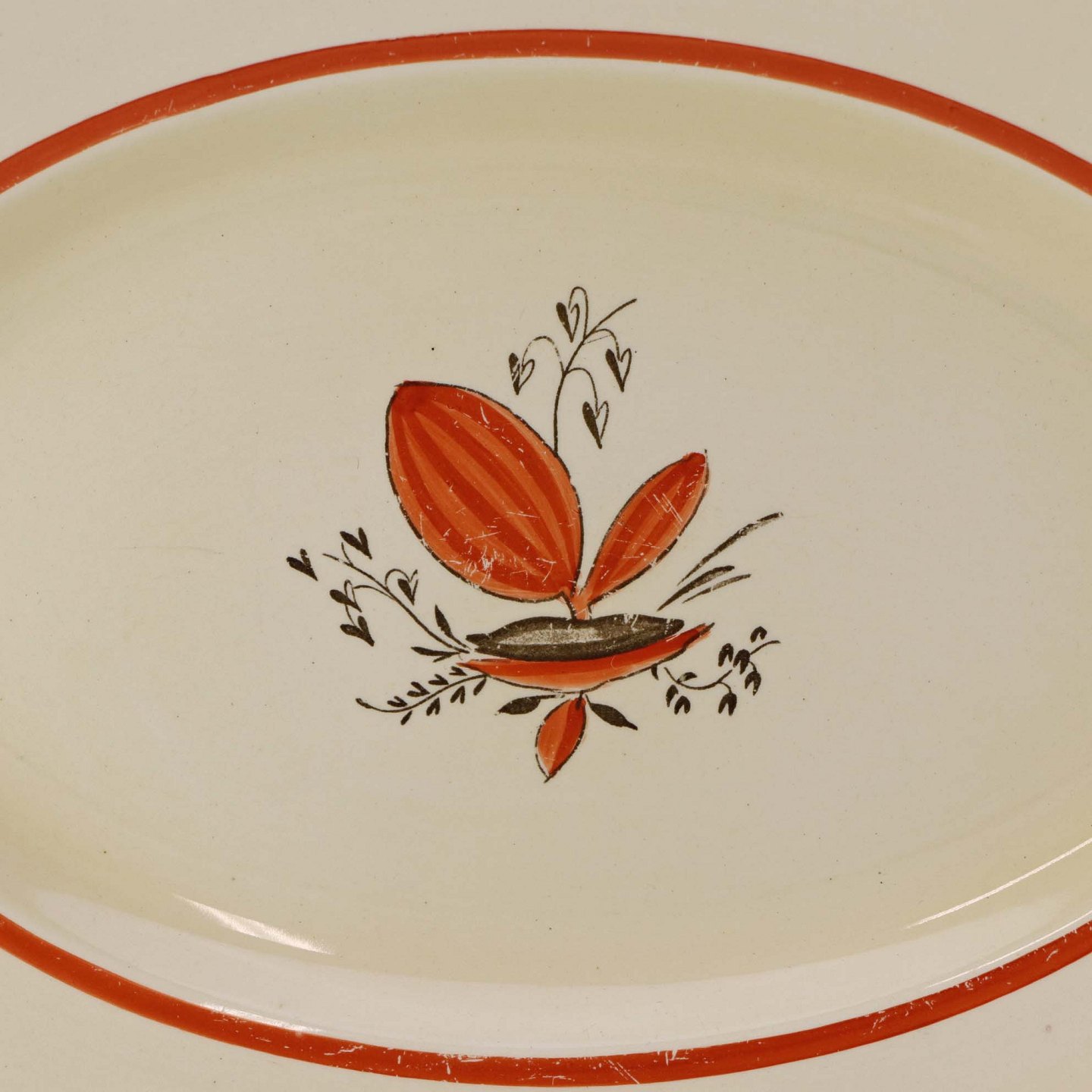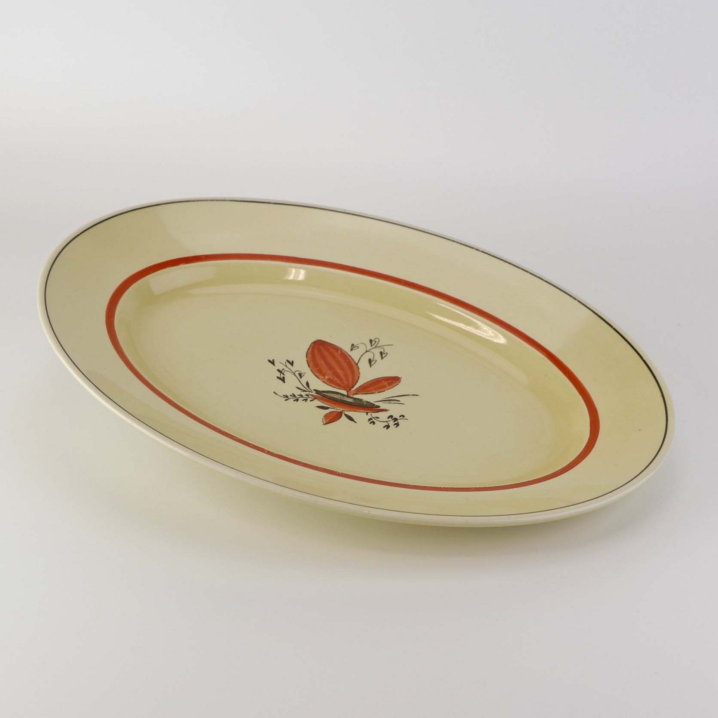 Ovalt fad i fajance fra stellet Silkeborg fremstillet i perioden 1937-1939Formgiver Thorkild Olsen