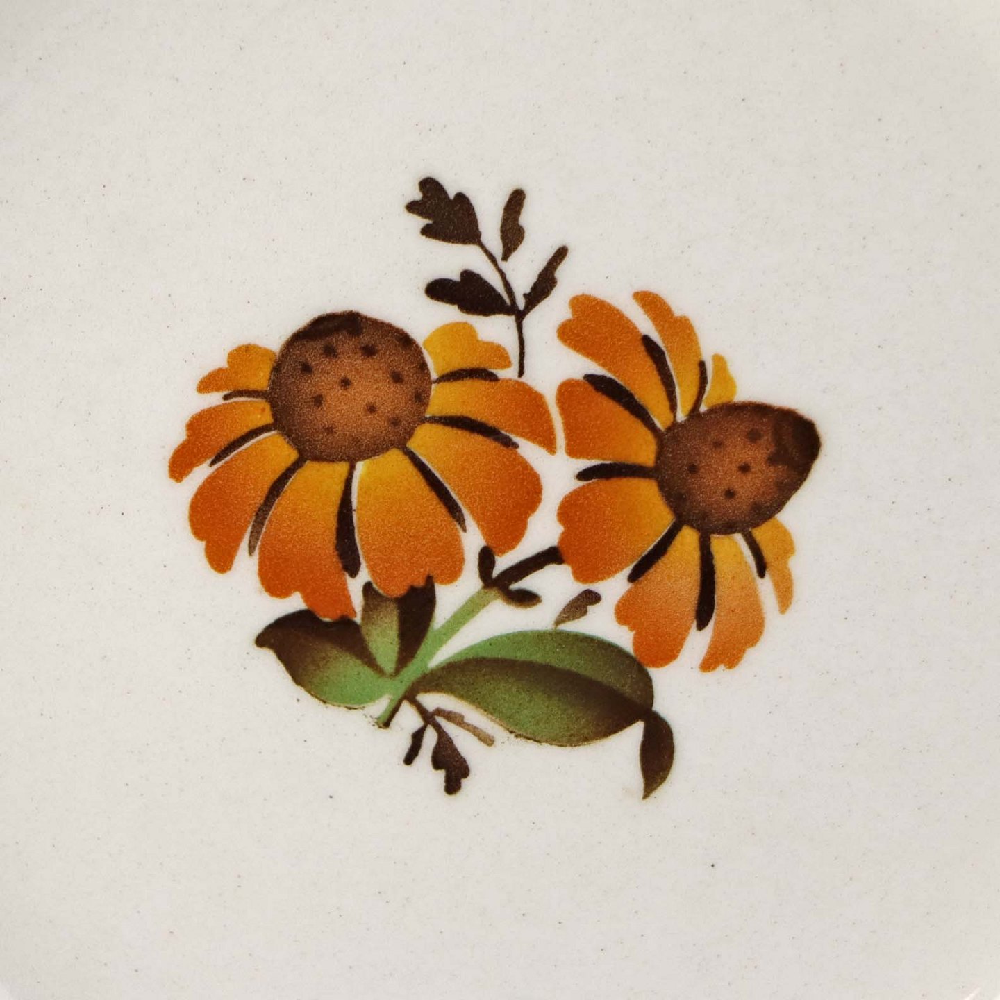 Fajancestel i stelform G med dekoration af orangegule blomster og grønne guirlander på lys baggrund med brun kant.