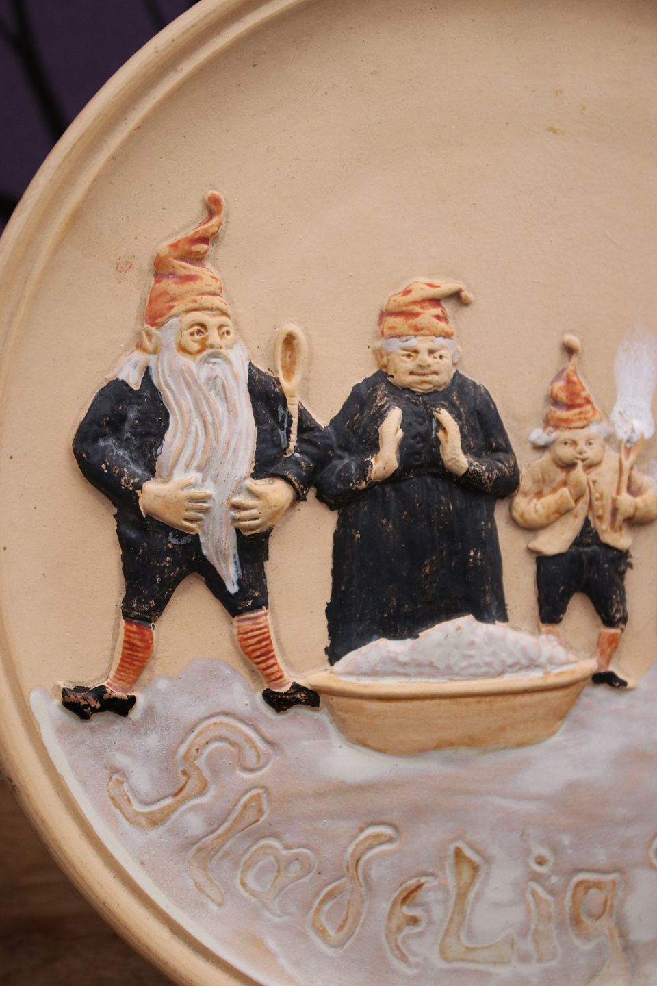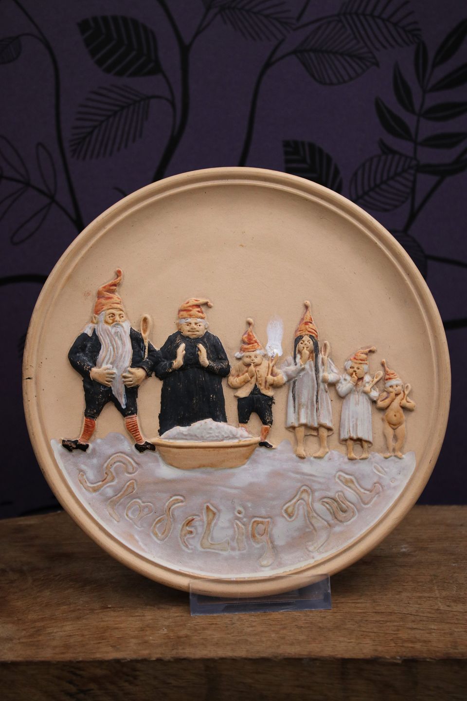 Old Christmas plate in terracotta with a motif of a family of elves gathered around rice porridge and Merry Christmas written at the bottom. Dia.: 18.5cm. Dealer