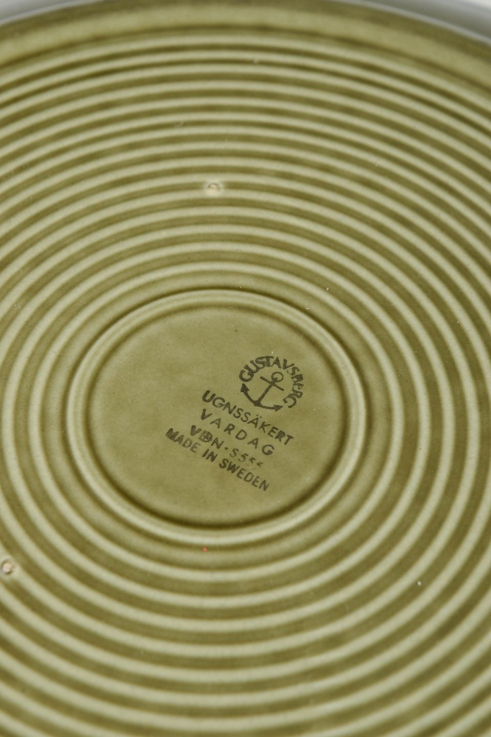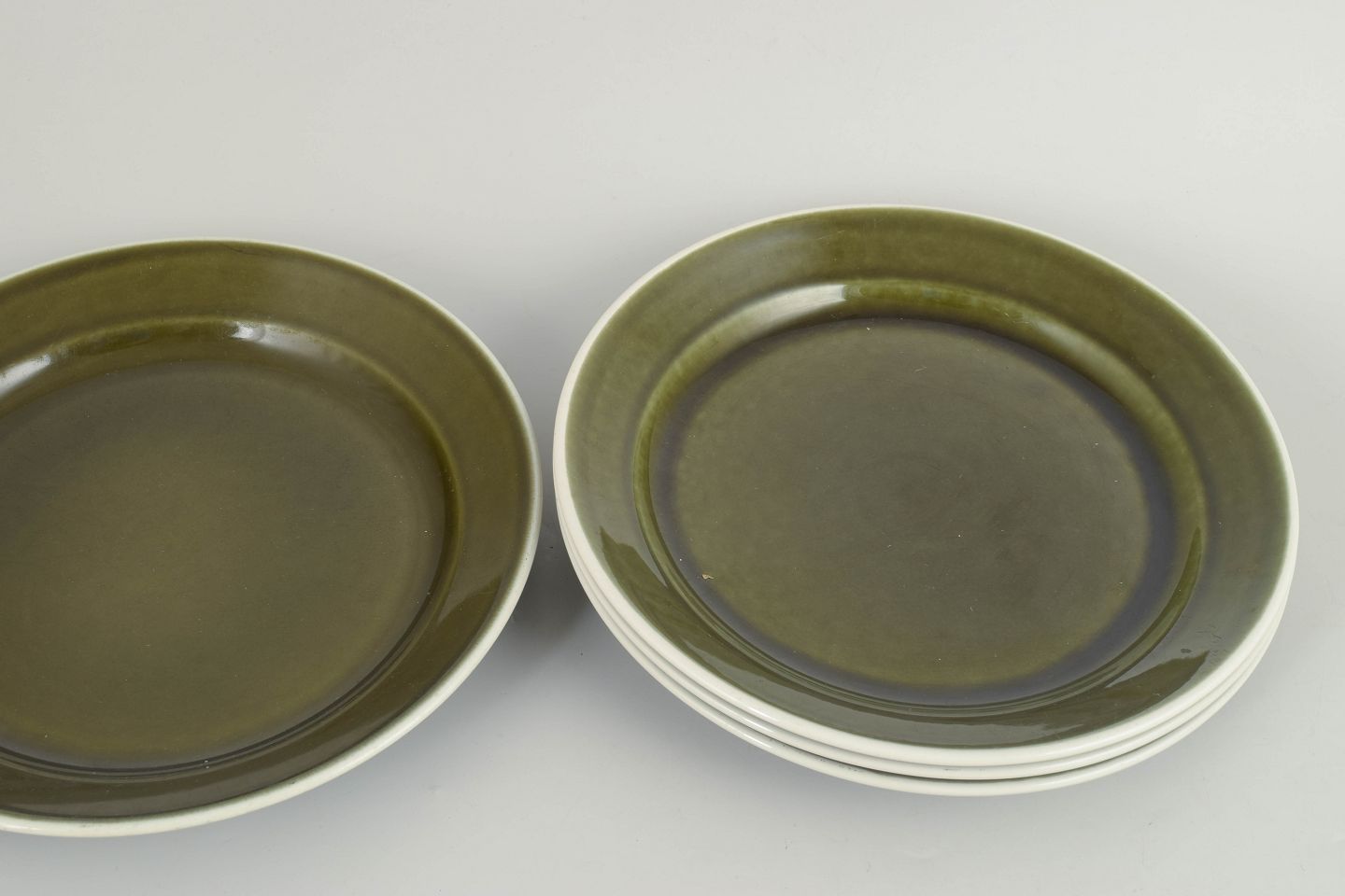 Stig Lindberg for Gustavsberg, set of 4 dinner plates.Set of four dinner plates in glazed stoneware from the "Vardag" series. The plates feature a simple, functional design with a wide rim and deep centre, finished in a characteristic green glaze with dark edging, typical of Stig Lindberg’s everyday tableware from the 1970s.