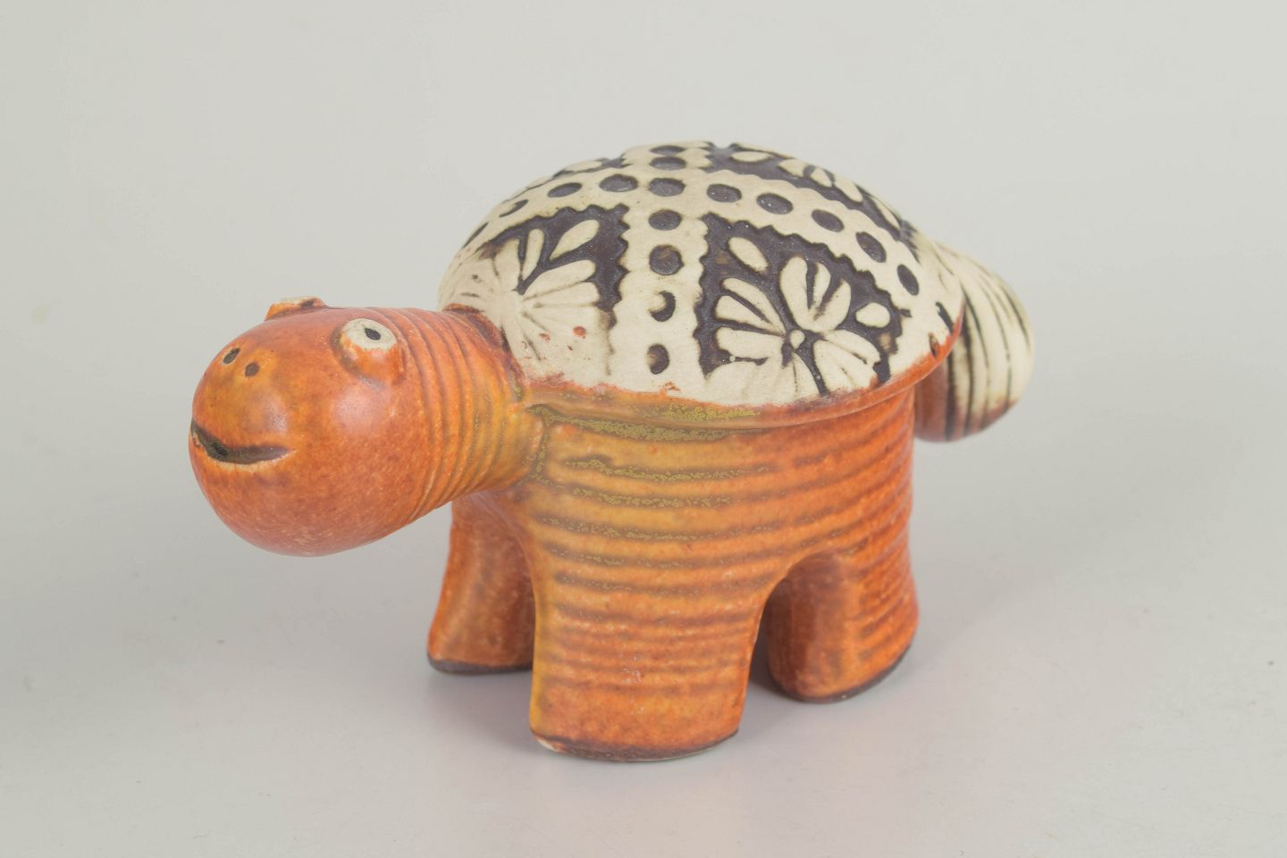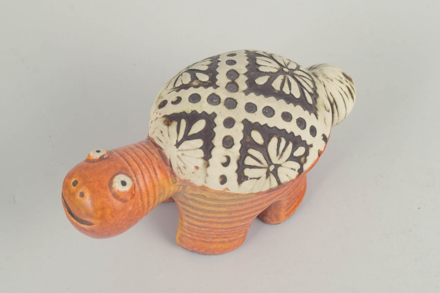 Stylised stoneware turtle with a compact, almost architectural body and short, sturdy legs. Finished with a warm orange-brown glaze to the body and a contrasting shell decorated with graphic floral and dot motifs in black and off-white. A characteristic example of Lisa Larson’s figurative design from the 1970s, combining humour, simplicity, and strong decorative presence.