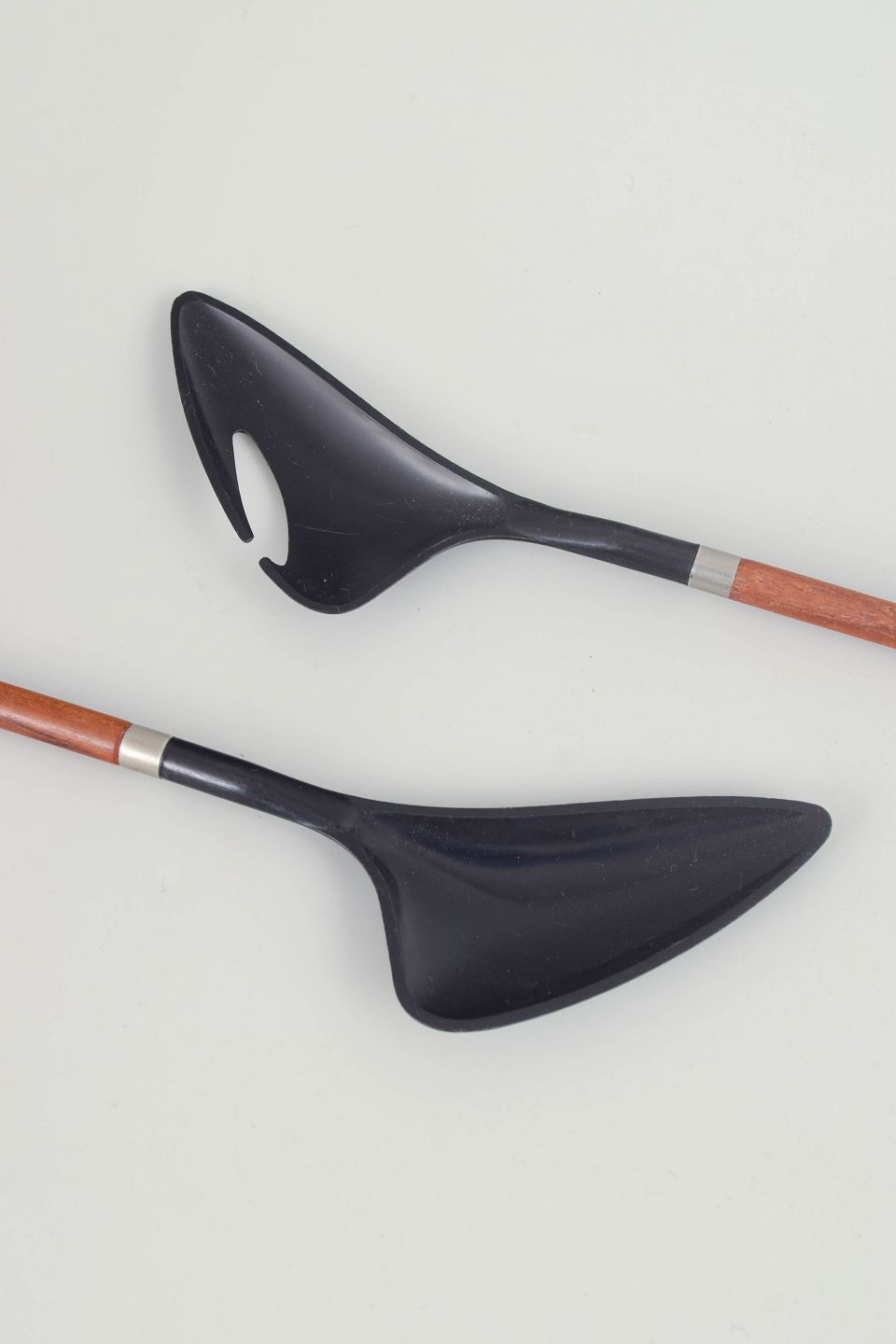 Illums Bolighus, salad serving set.Elegant modern Danish design salad set with slender shafts in exotic wood and organically shaped black serving heads. Light, sculptural and practical for both everyday use and table settings. Marked “Denmark”.