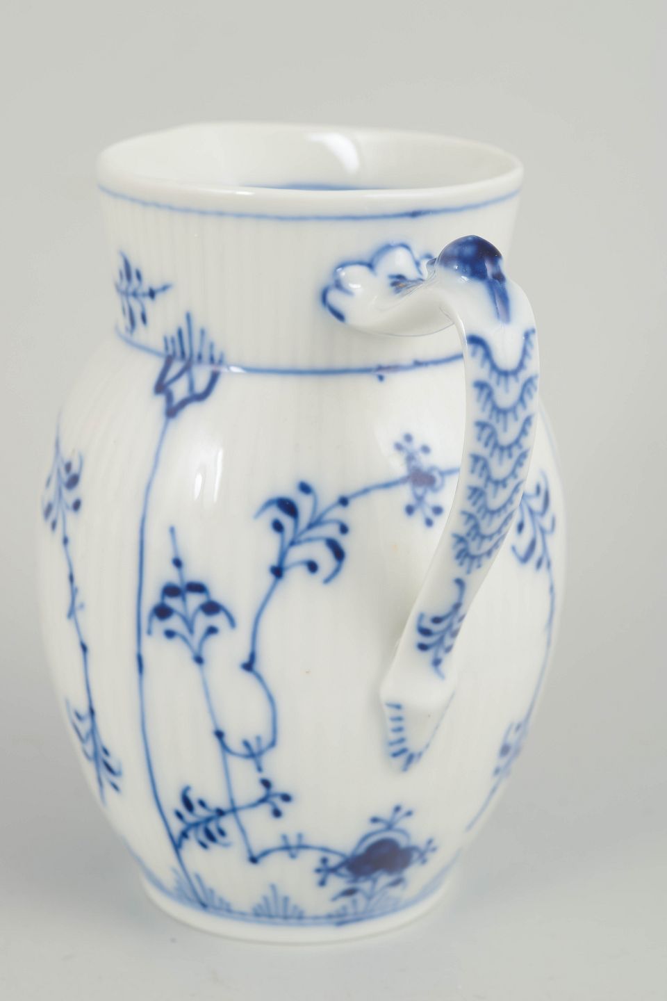 Fluted creamer in glazed porcelain with hand-painted cobalt-blue underglaze decoration. Classic baluster-shaped body with a curved spout and decorative handle. Model 1/459.