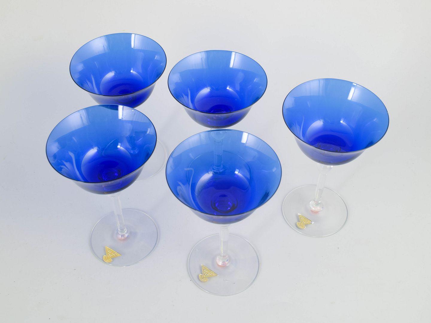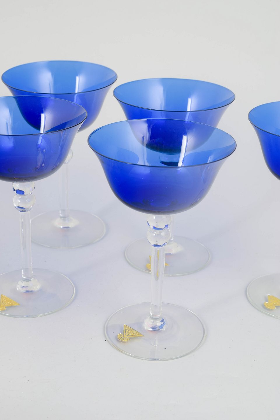 Gullaskruf Glasbruk, set of 5 champagne glasses.Set of five handmade art glass champagne glasses with deep blue bowls and clear, elegant stems. The glasses feature a balanced, period-specific design in which the coloured bowls contrast with the transparent stems and bases. A characteristic example of Swedish art glass from the 1960s and 70s, combining colour and function in a restrained and refined form. The model is executed as coupe-style champagne glasses.