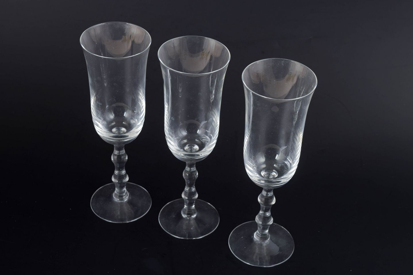 Simon Gate for Orrefors, set of 3 champagne glasses.Set of three champagne glasses in clear glass with a slender bowl and a baluster-shaped stem on a round foot. A classic Scandinavian silhouette with light, well-balanced proportions, executed in Orrefors’ renowned clear glass quality. Model : “Salut”.