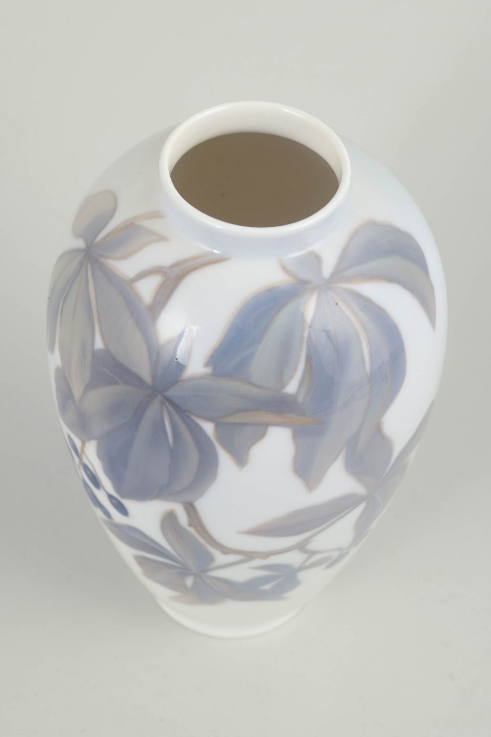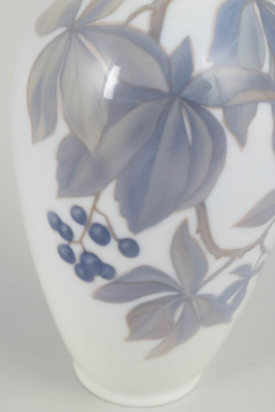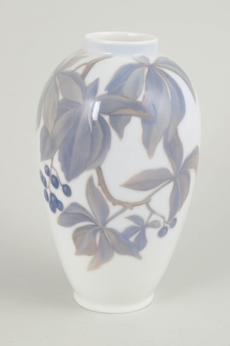 Royal Copenhagen, vase.Slender baluster-shaped porcelain vase with a hand-painted underglaze decoration of stylised leaves and berries in muted blue-grey and brownish tones on a white ground. The decoration follows the form of the vase with a light, flowing rhythm. Model 1218, decoration 44c, dating from the 1920s.