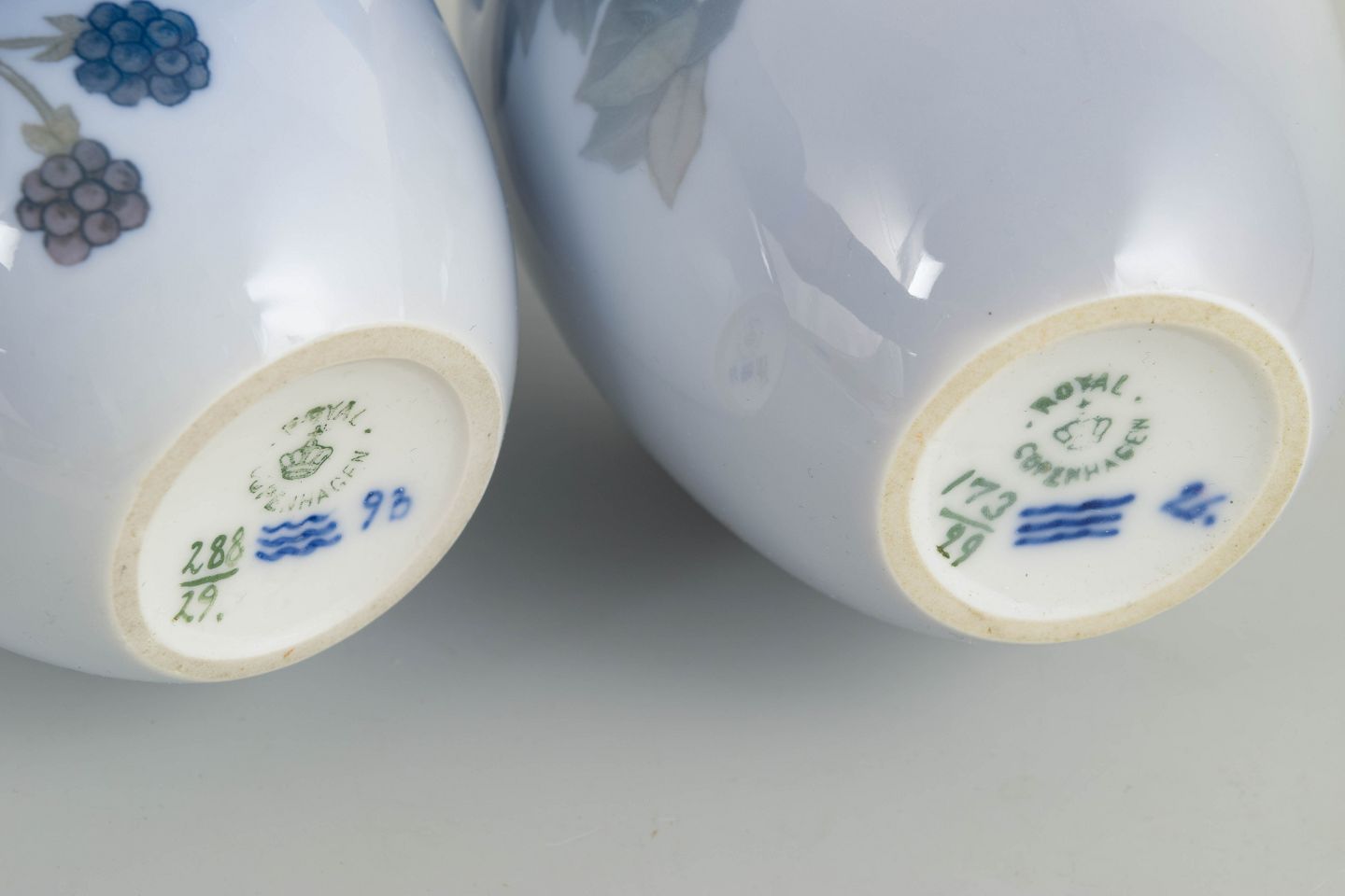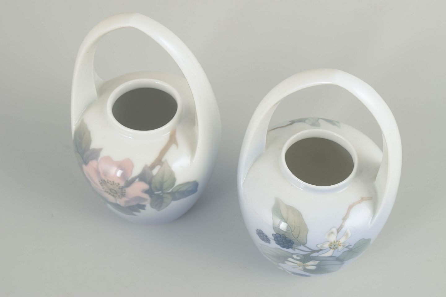 Royal Copenhagen, Art Nouveau vases with handles, set of 2.Set comprising two vases in glazed porcelain with integrated handles and hand-painted underglaze decoration in Art Nouveau style. The decoration features floral and berry motifs in subdued blue, green and pink tones. Models 173/29 and 288/29.