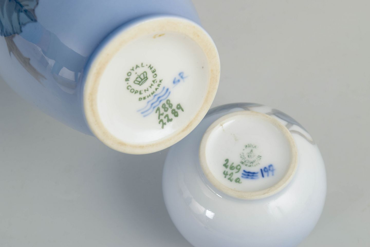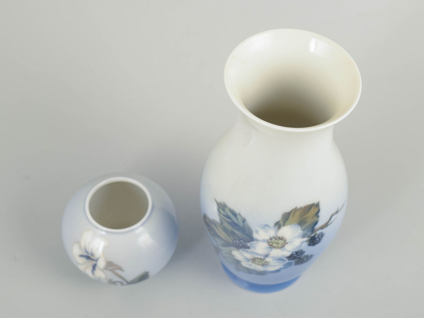 Royal Copenhagen, vases, set of 2.Set comprising two vases in glazed porcelain with hand-painted underglaze decoration. The larger vase has a baluster form with floral decoration over a blue-toned ground and is produced after model 288/2289. The smaller vase features a rounded body with floral decoration in subdued tones and is produced after model 269/42a.