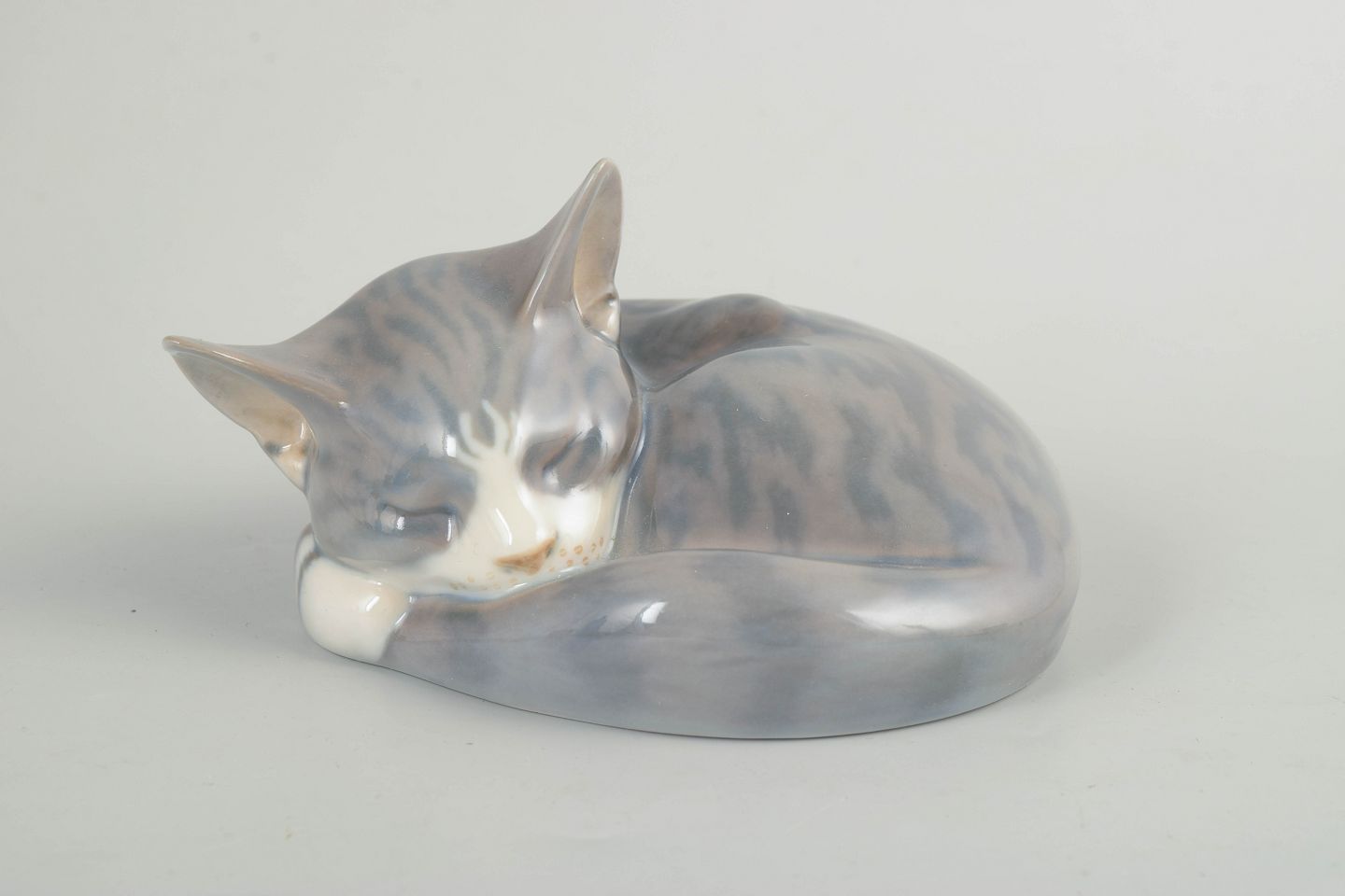 Royal Copenhagen, sleeping cat figurine.Porcelain figurine depicting a curled, sleeping cat, modelled with soft lines and finished in a subtle grey and white glaze with delicate tonal variations. Model 422.