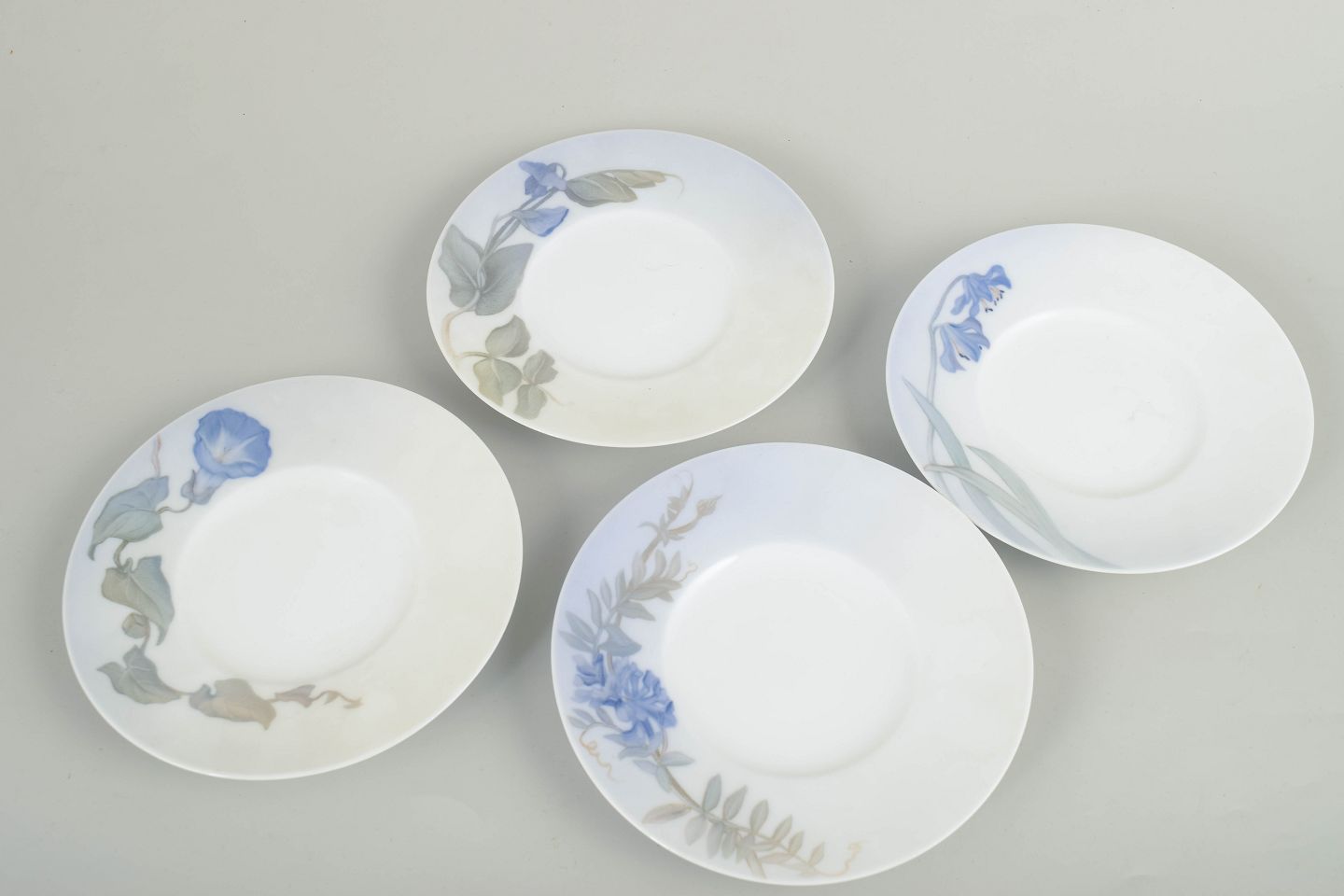 Royal Copenhagen, Art Nouveau unique plates, set of 4.Set of four plates in glazed porcelain with hand-painted underglaze decoration in Art Nouveau style, featuring stylised floral and foliage motifs in subdued blue and green tones.