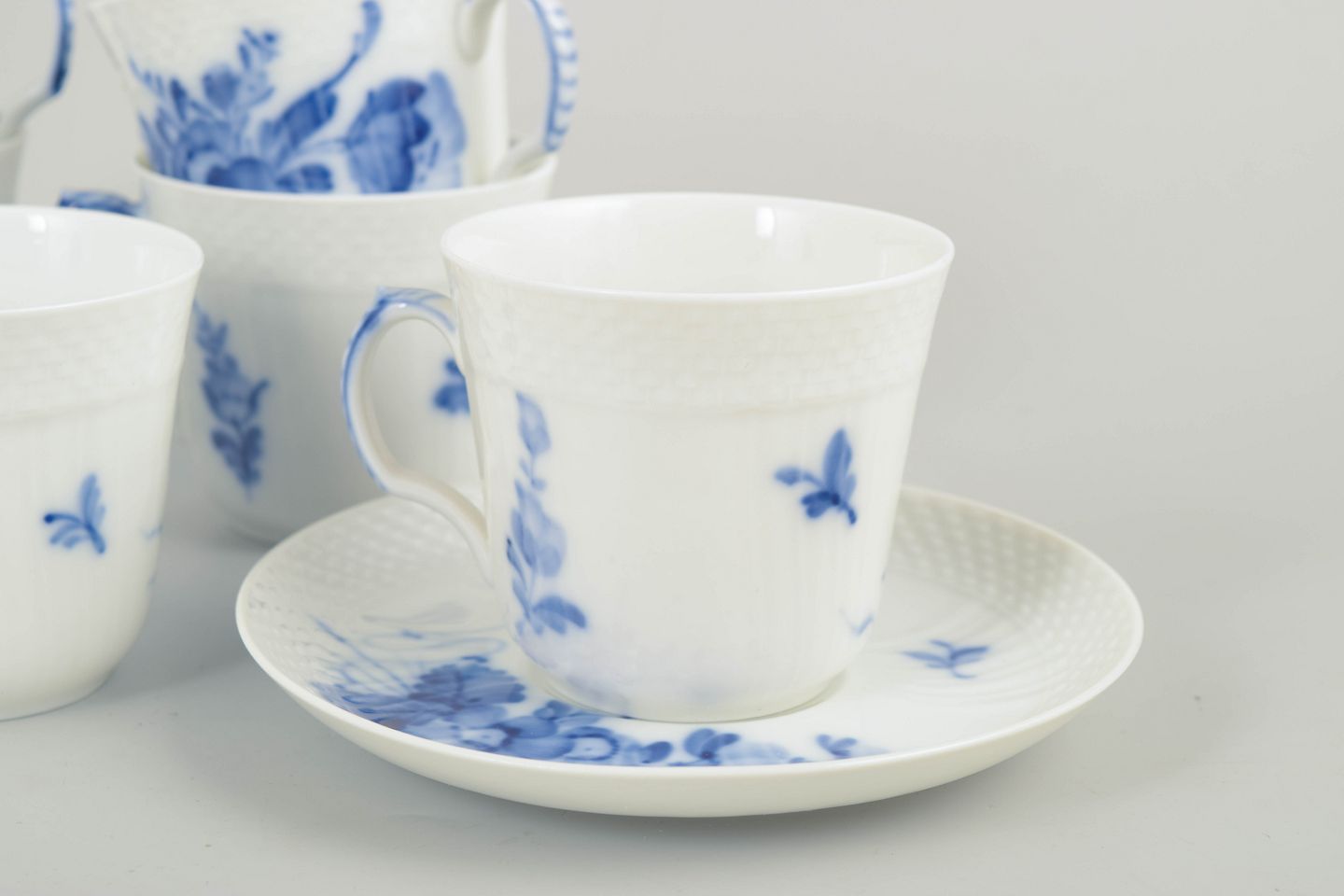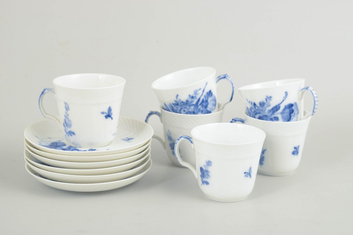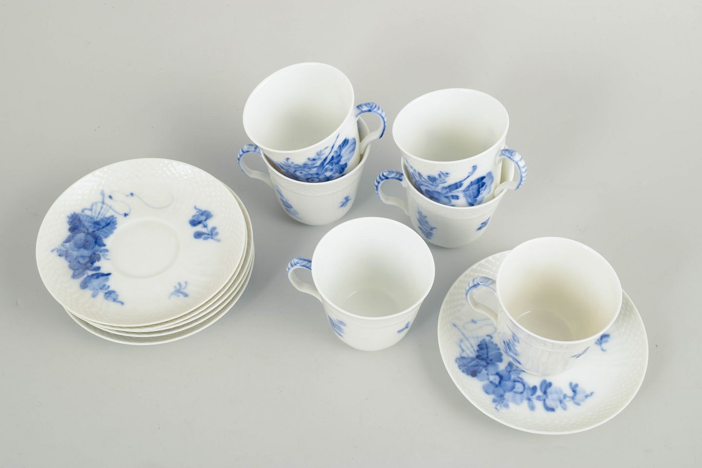 Royal Copenhagen, Blue Flower Braided coffee cups, set of 6.Set consisting of six coffee cups with matching saucers in glazed porcelain with hand-painted underglaze decoration in the classic Blue Flower Braided pattern. Model 10/1546.