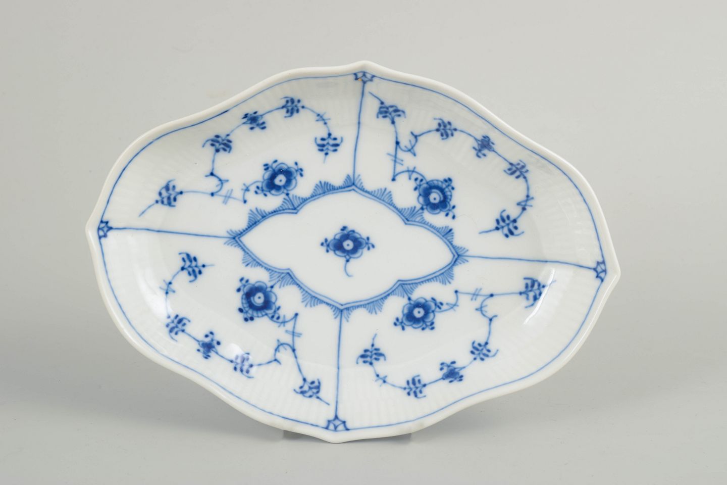 Royal Copenhagen, Blue Fluted Plain dish.Oval dish in glazed porcelain with hand-painted underglaze decoration in the classic Blue Fluted Plain pattern. Produced after Royal Copenhagen model 1/147.