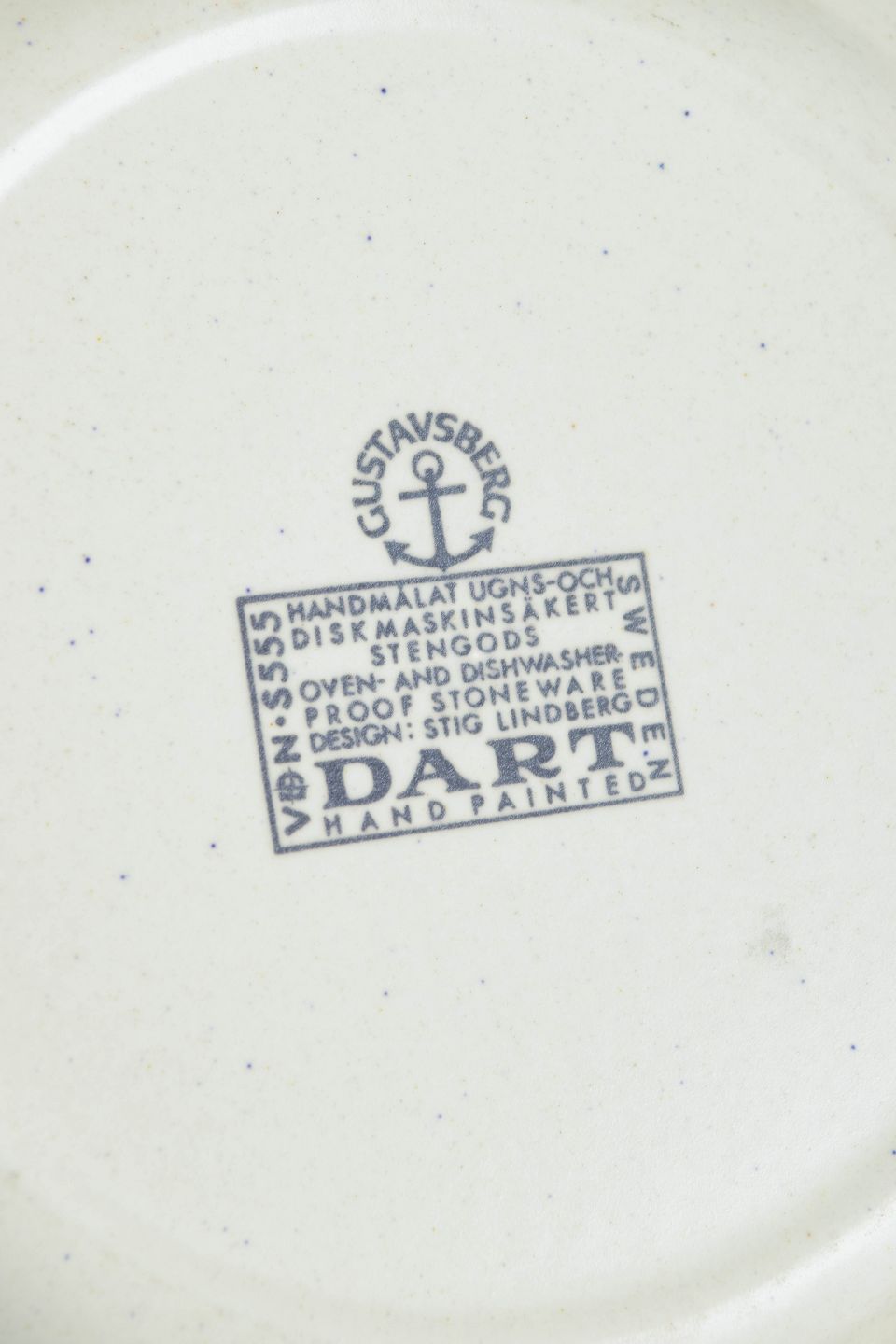 Stig Lindberg for Gustavsberg, six salad plates.Set of salad plates in faience with a simple circular form and restrained blue line decoration on a light ground. The plates are produced as part of Gustavsberg’s “Dart” series, characterised by its clean and graphic expression, typical of Stig Lindberg’s work from this period.
