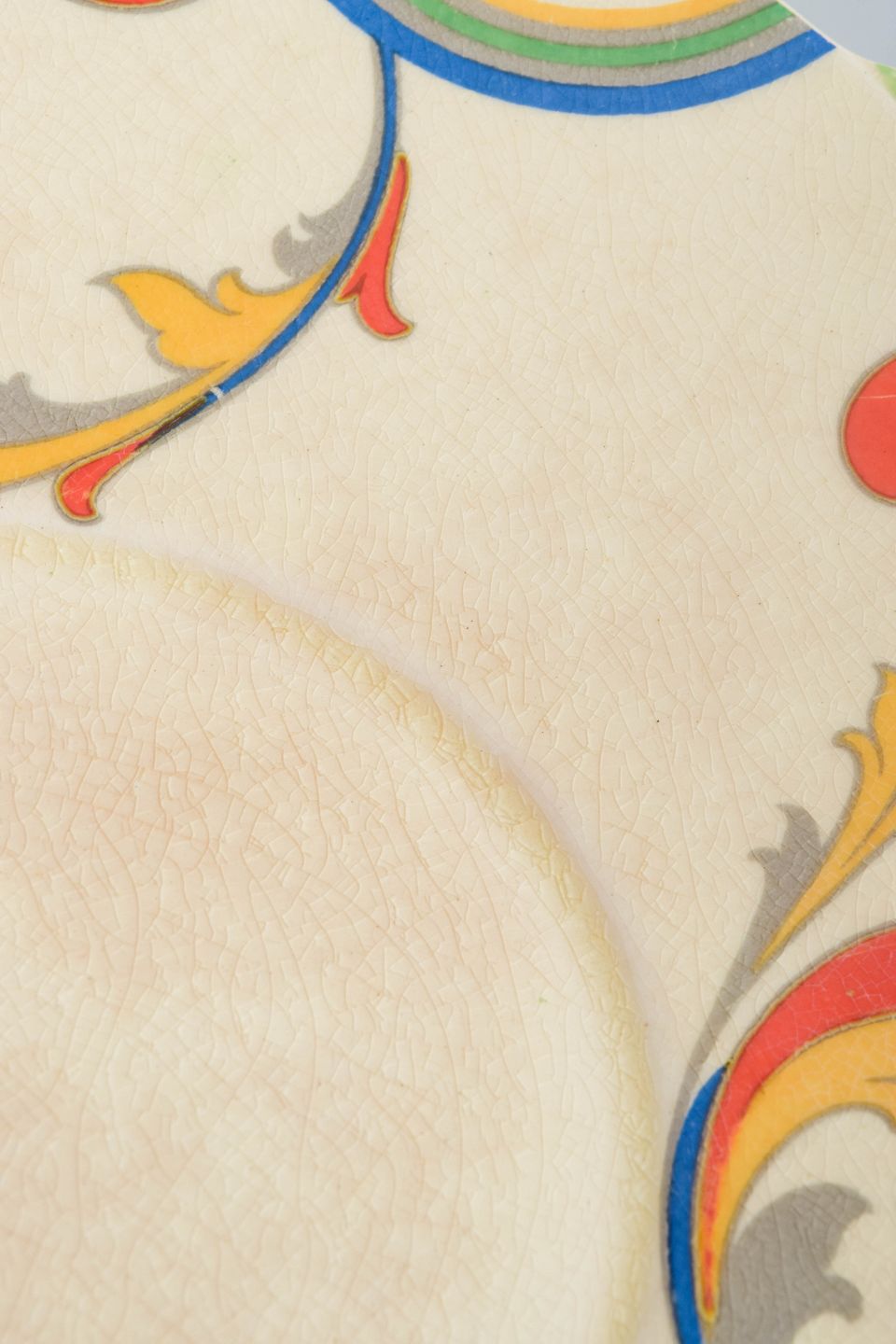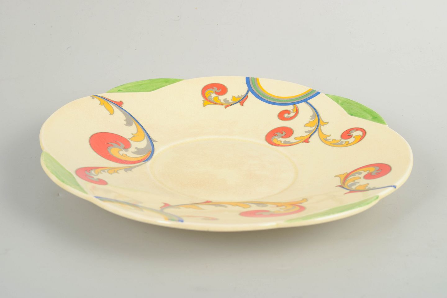 Clarice Cliff for Royal Doulton, serving dish.Art Deco faience serving dish with a craquelure glaze and hand-painted decoration from the “Syren” series. The dish features a round form with a softly scalloped rim and a dynamic, stylised floral motif in vivid, contrasting colours, characteristic of Clarice Cliff’s interwar design language.