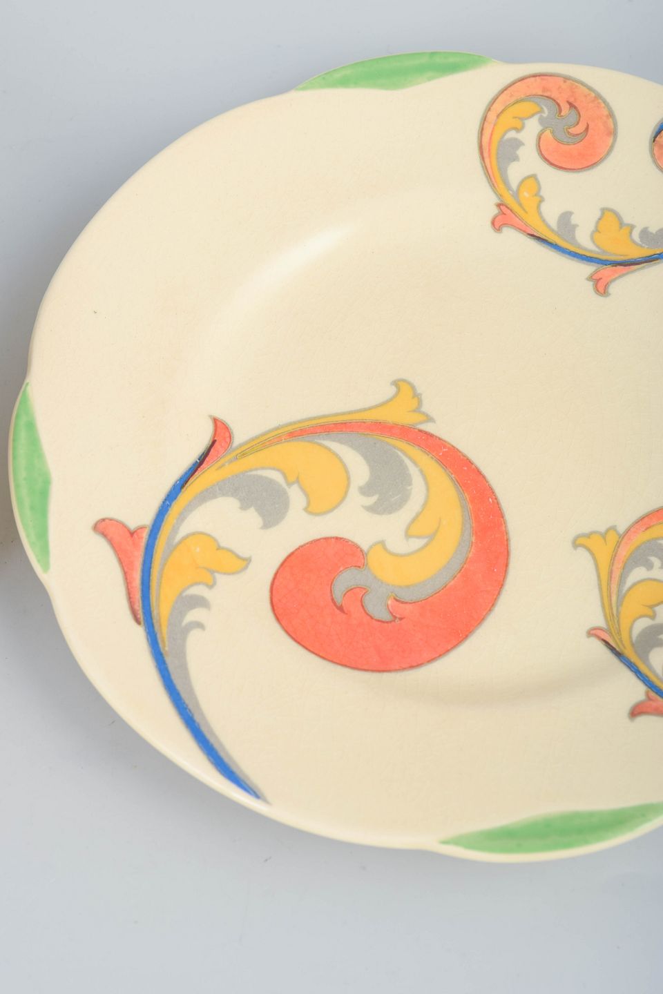 Clarice Cliff for Royal Doulton, set of 6 cake plates.Art Deco faience cake plates with colourful hand-painted decoration from the “Syren” series. The plates feature a round shape with a gentle rim and a vivid, stylised floral motif in bright, period-typical colours, characteristic of Clarice Cliff’s interwar production.