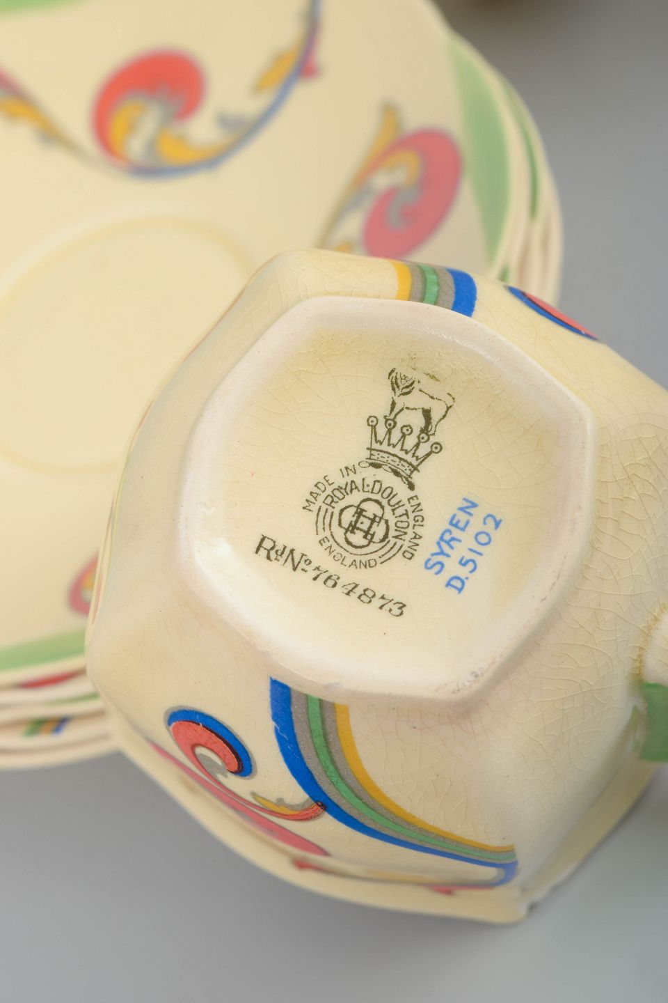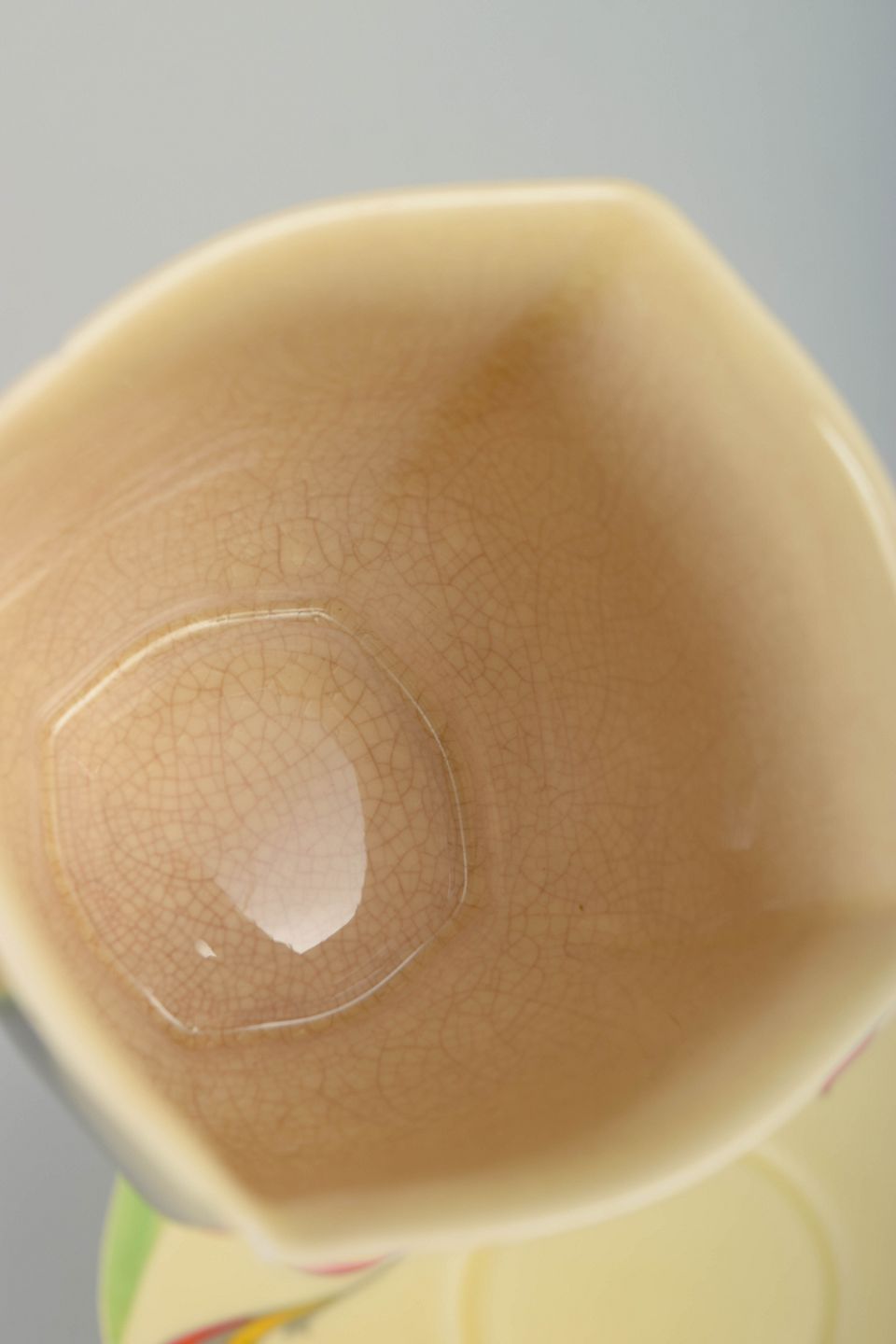 Clarice Cliff is one of the most celebrated names in British Art Deco ceramics, best known for her bold decorative language and modern forms produced for Royal Doulton. Craquelure is frequently seen on period faience glazes and contributes to the authentic, time-specific appearance that makes her tableware highly collectible today.