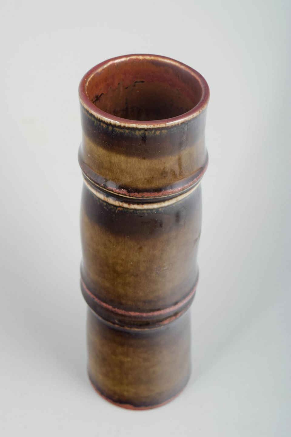 Olle Alberius for Rörstrand, vase.Tall, cylindrical stoneware vase with a pronounced vertical structure and subtly profiled rings. The surface is covered with expressive, flowing glazes in warm brown, amber, and beige tones, creating depth and variation typical of Rörstrand’s artistic stoneware production of the 1970s.