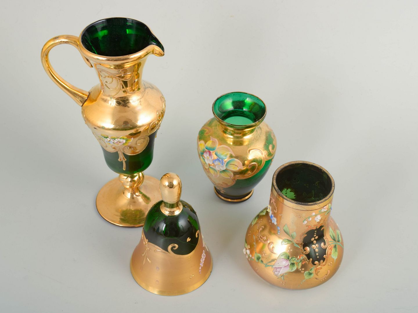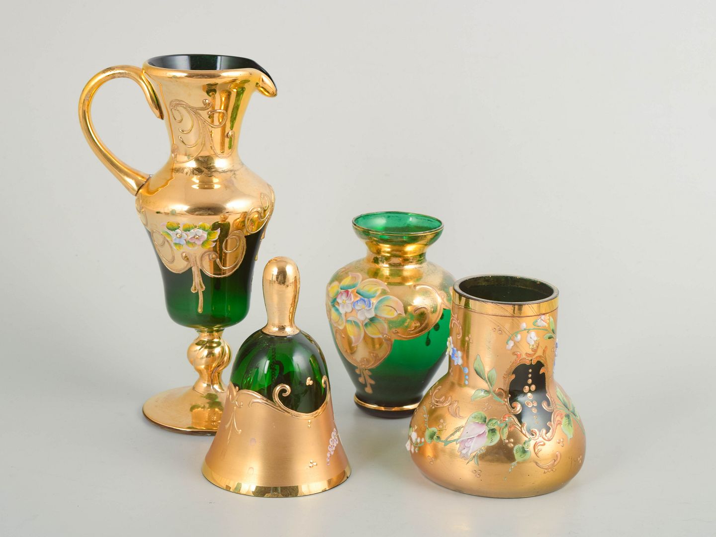 Bohemian glass, set of four pieces.Decorative set comprising four pieces in green glass with rich gilt decoration and enamel-painted floral motifs. The set includes a small pitcher, a bell-shaped piece with finial, and two vases in varied forms. Hand made in Bohemia, showing clear variation in shape and proportions.