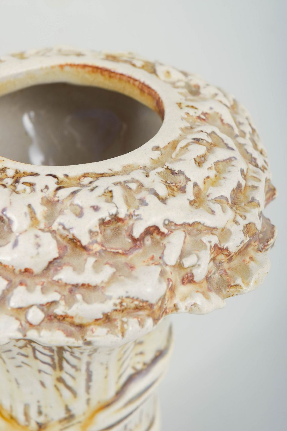 Höganäs, vase.Strongly modelled stoneware vase with pronounced relief decoration and a thick, flowing glaze in cream and brown tones. The surface has a distinctive, almost bark-like character that emphasises the sculptural form. Signed “KB” to the base. Produced by Höganäs Keramik and dated to approximately the 1960s.