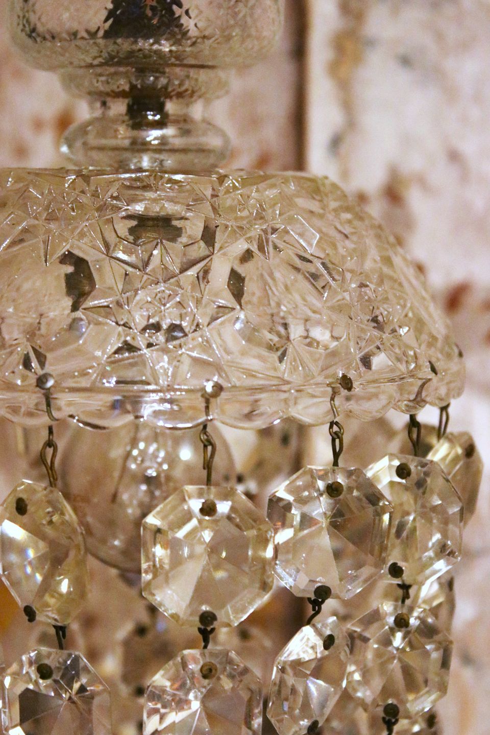 Old "bag prism" ceiling lamp, glass shade with chains of fine cut glass prisms.
