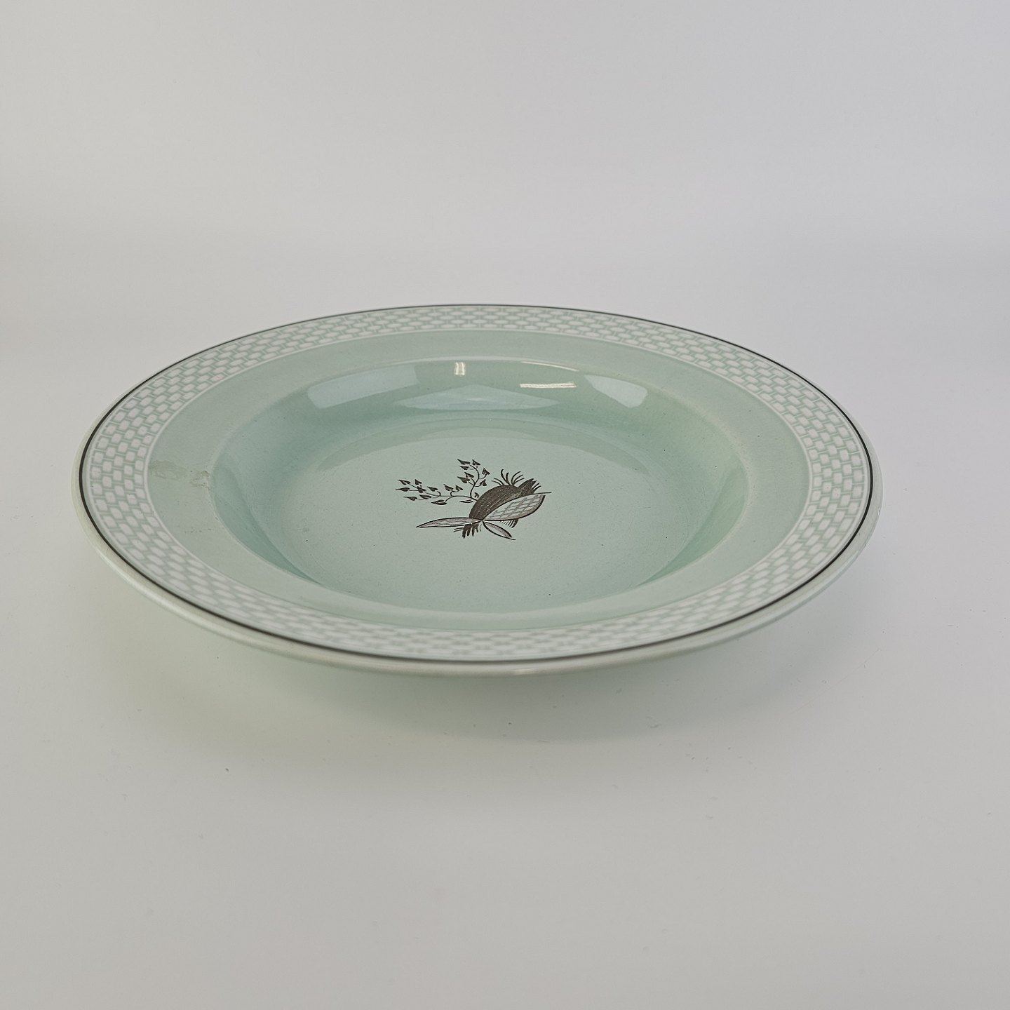 Stel i lysegrøn fajance med natur dekoration og flettet kant