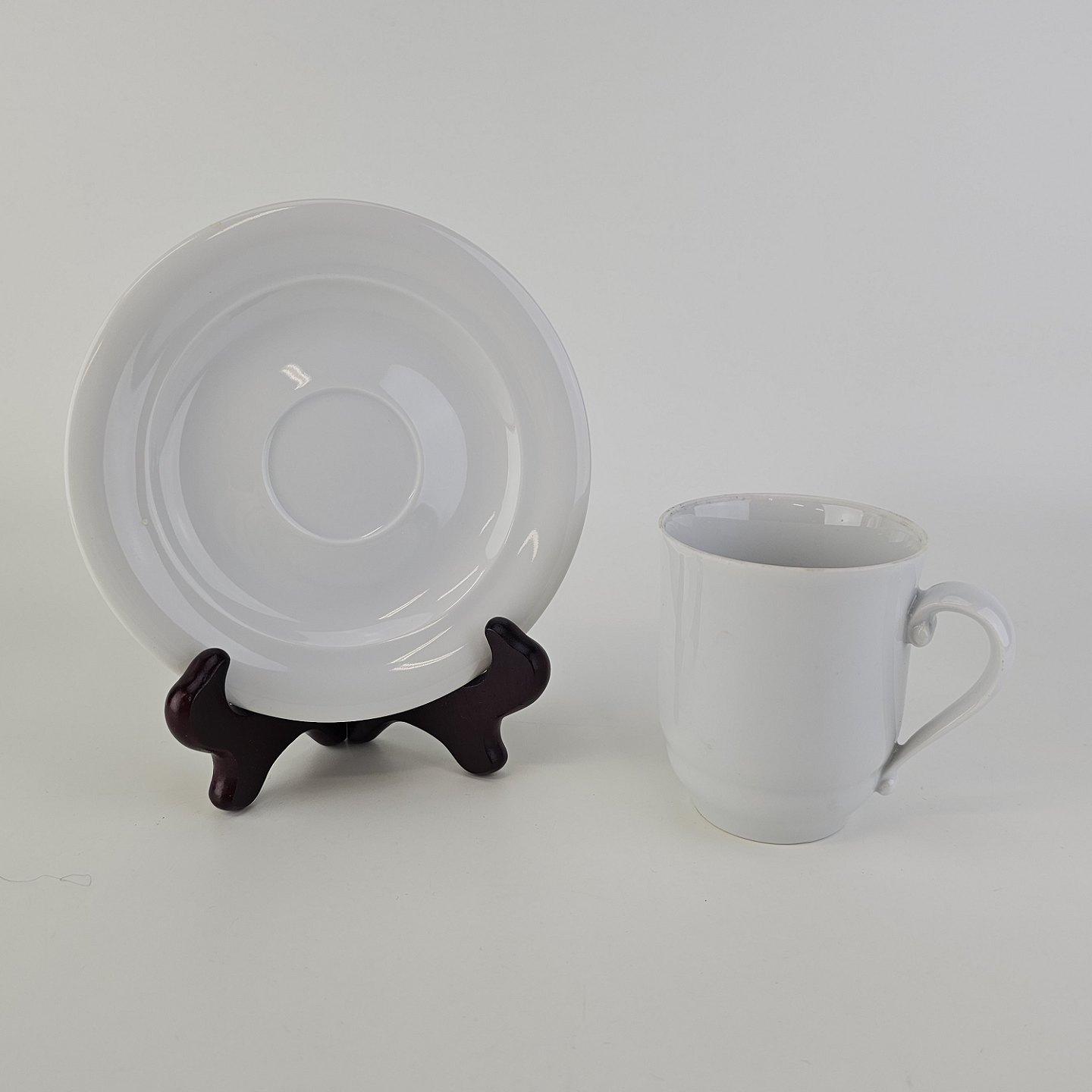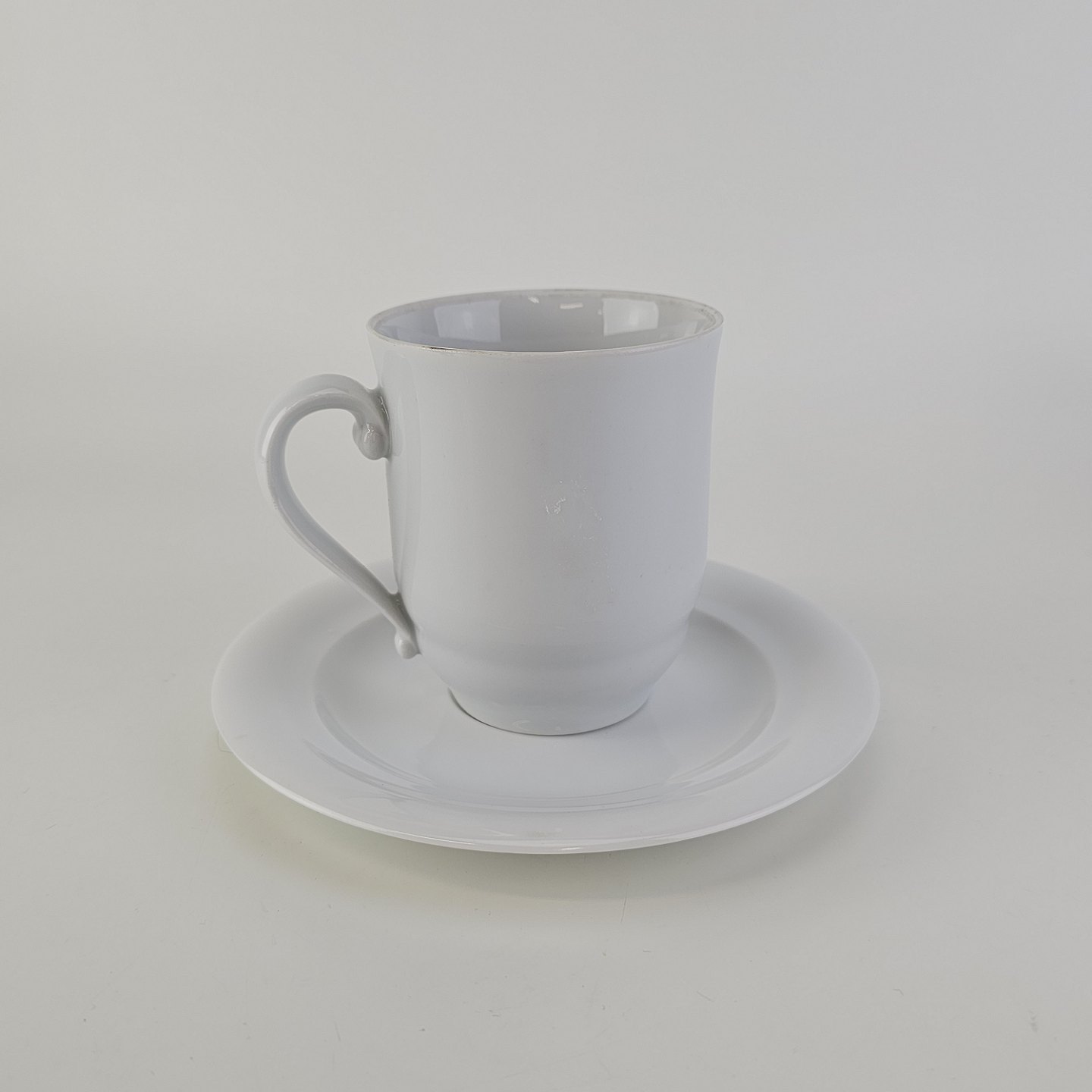 Høj kop med underkop i hvidt kongeligt porcelæn