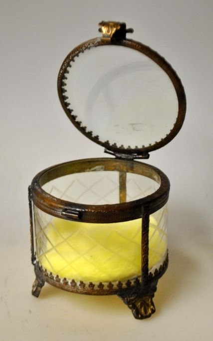 Jewelry box, France, circa 1900. With faceted glass and decorated brass frame and three legs. H.: 8 cm. Dia.: 8 cm.Item number: 28770