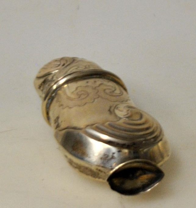 Rococo vinagrette egg in silver, 18th century. Denmark. With external rococo decorations. Internally gilded. Unmarked. H.: 7.5 cm. On a newer oval foot.NB: Part of the comb is missing. Rare shape.