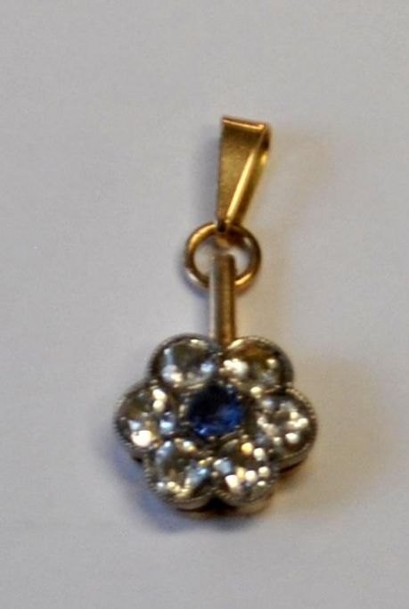 14 carat gold pendant with 6 old diamonds and a sapphire, 19th century. Mounted as a flower. Diamonds with old cut. Total 6/8 carats. H.: 2.7 cm. Dia. pendant: 1.3 cm.Item number: 28789