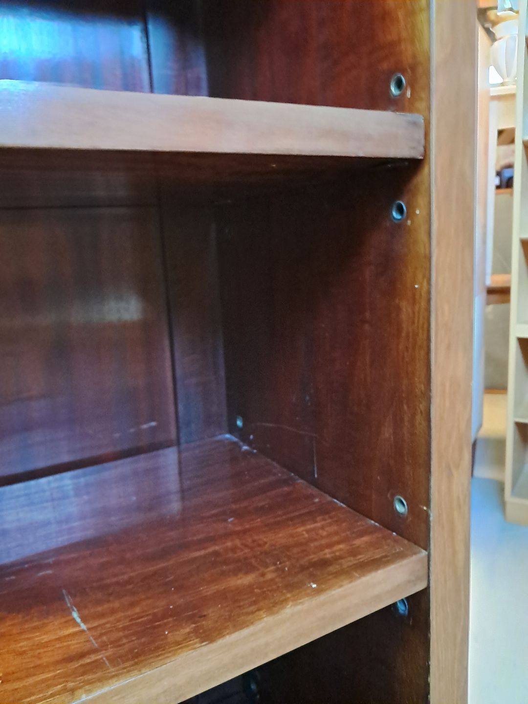 Reol i fineret mahogni, fra 1920erne.Den har brugsspor.