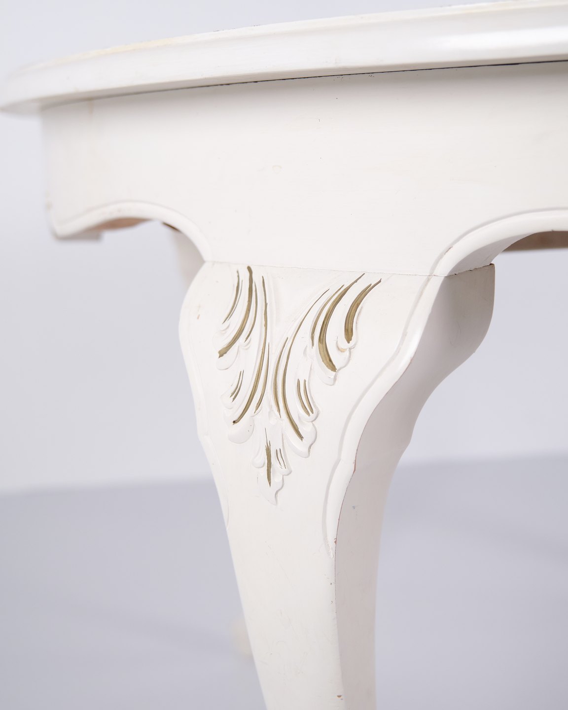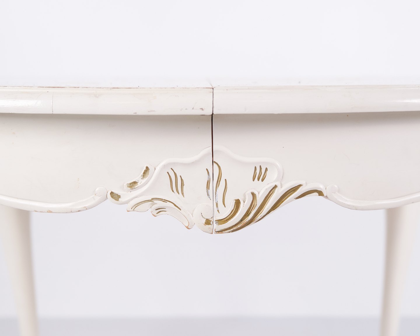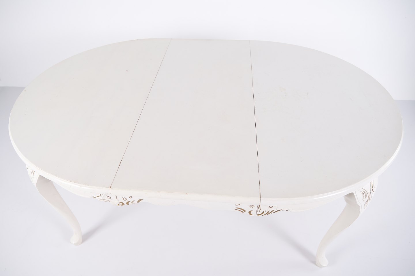 Antique round dining table in neo rococo style from the 1920s. White painted with decorative details and 4 extension leaves.— Style: Neo rococo