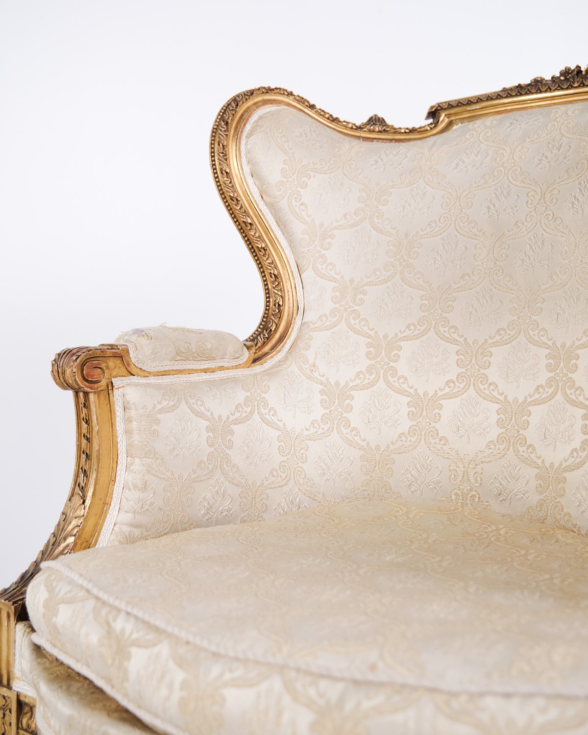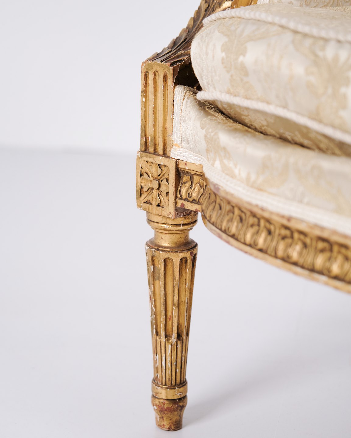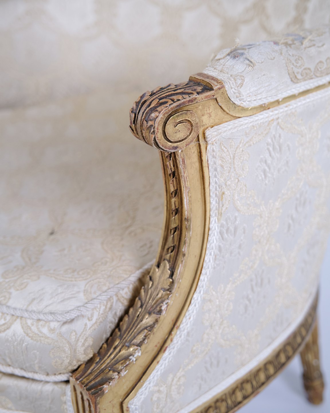 Antique bergère armchair from the 1860s in Louis XVI style. Gilded wood and light upholstery.— Style: Louis XVI