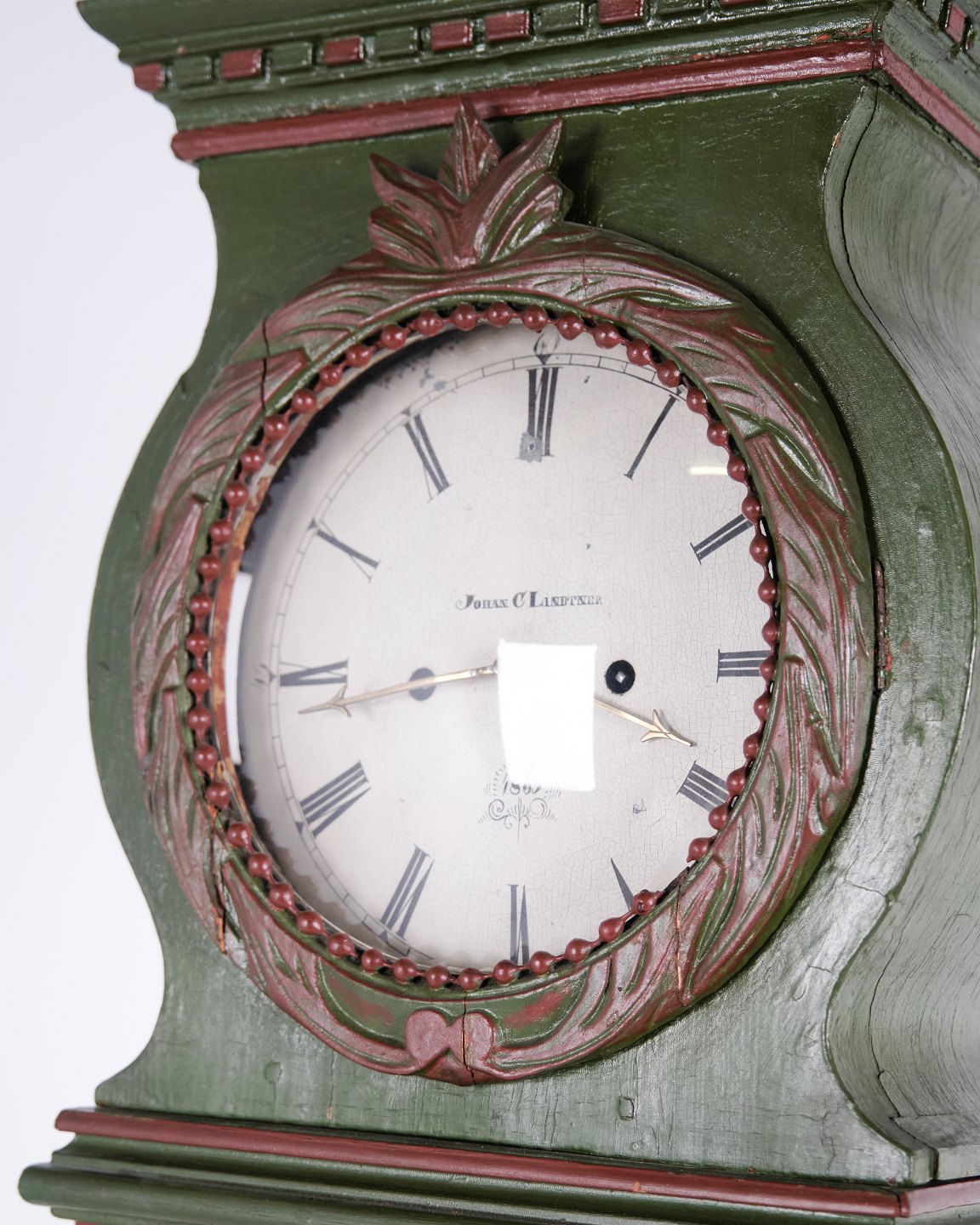 Bornholm Longcase Clock – “Frøken” Model – Hand-Painted With Carved Details – Green & Red Paint – 1860s