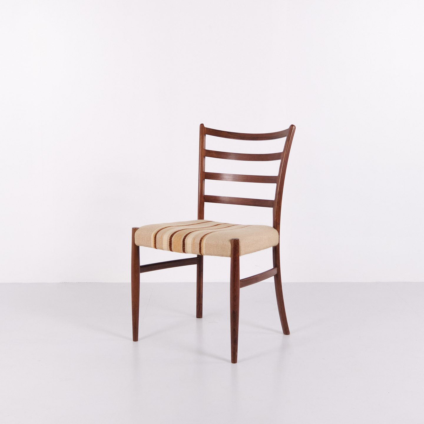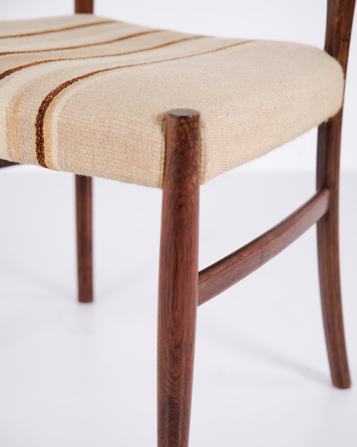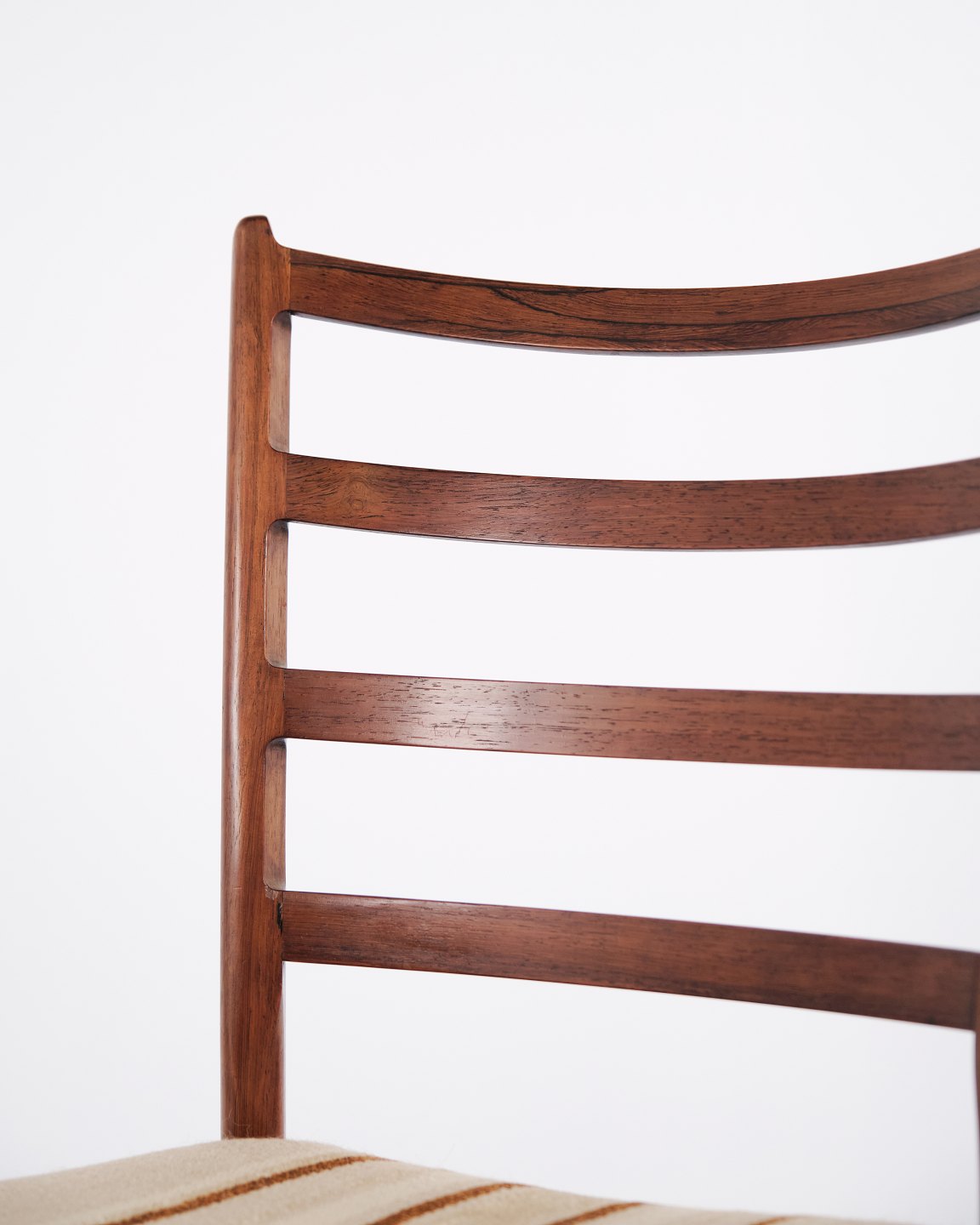 N.O. Møller dining chairs in rosewood with striped upholstery from the 1960s. Designed by J.L. Møllers Møbelfabrik.— Designer: N.O. Møller