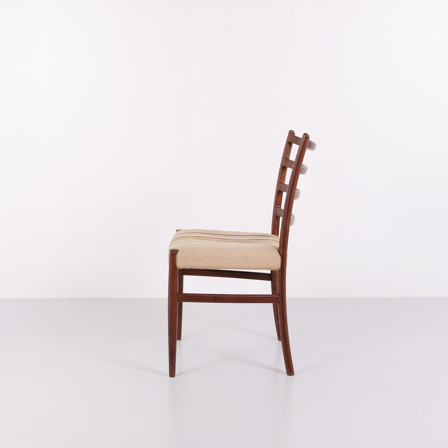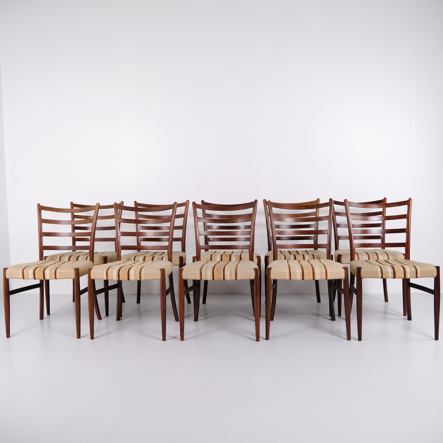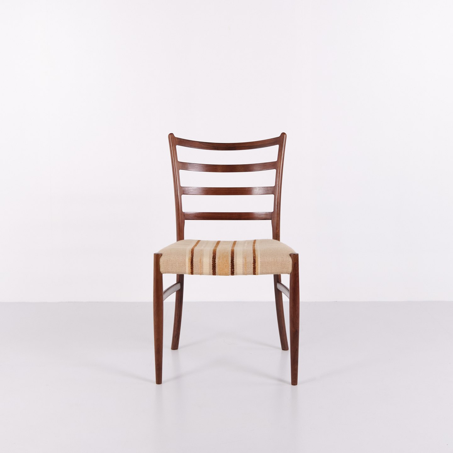 N.O. Møller dining chairs in rosewood with striped upholstery from the 1960s. Designed by J.L. Møllers Møbelfabrik.— Designer: N.O. Møller