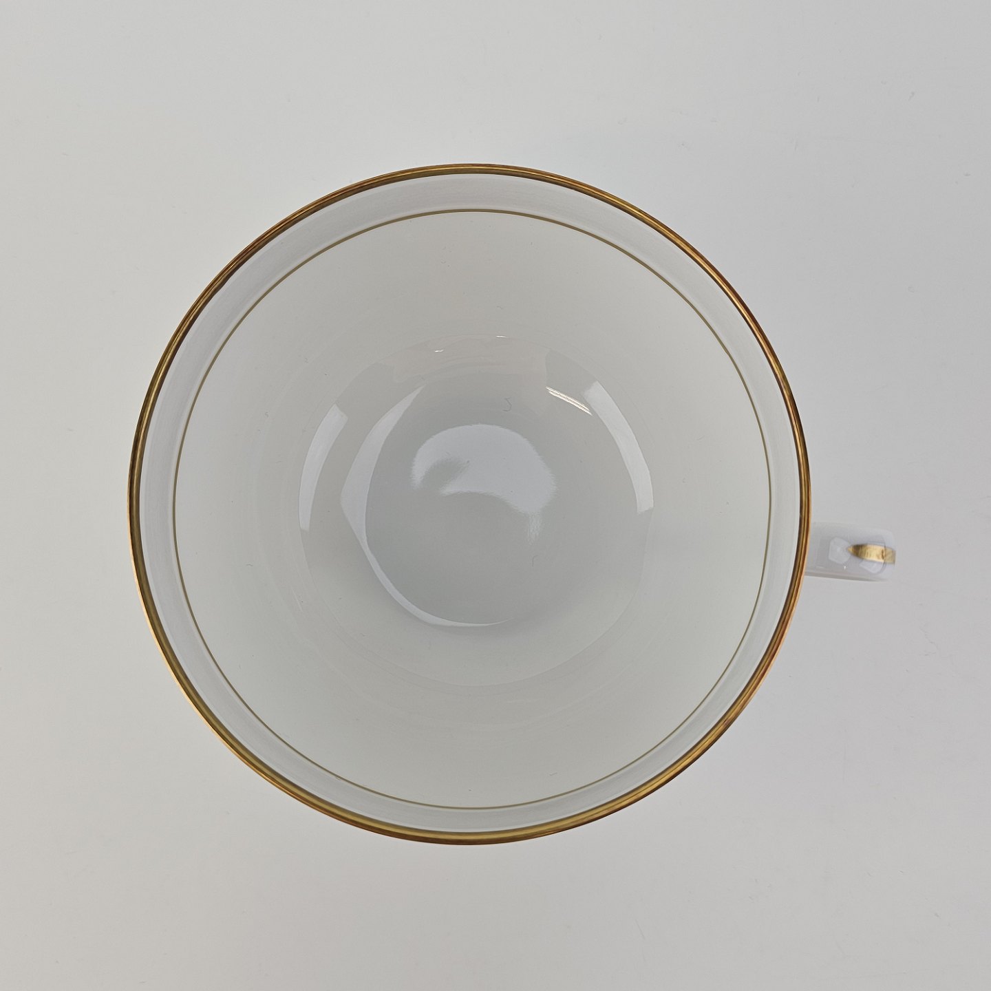 Tiber er stel i glat hvidt porcelæn med grå bort og guldkant