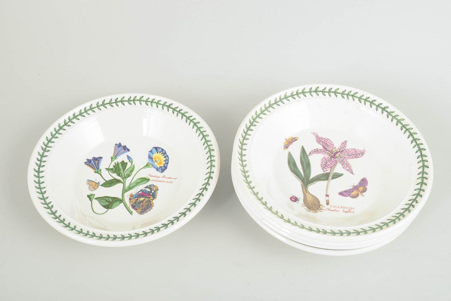 Set of 5 deep faience plates by Portmeirion, decorated in “The Botanic Garden” series with botanical motifs and the characteristic green leaf border.