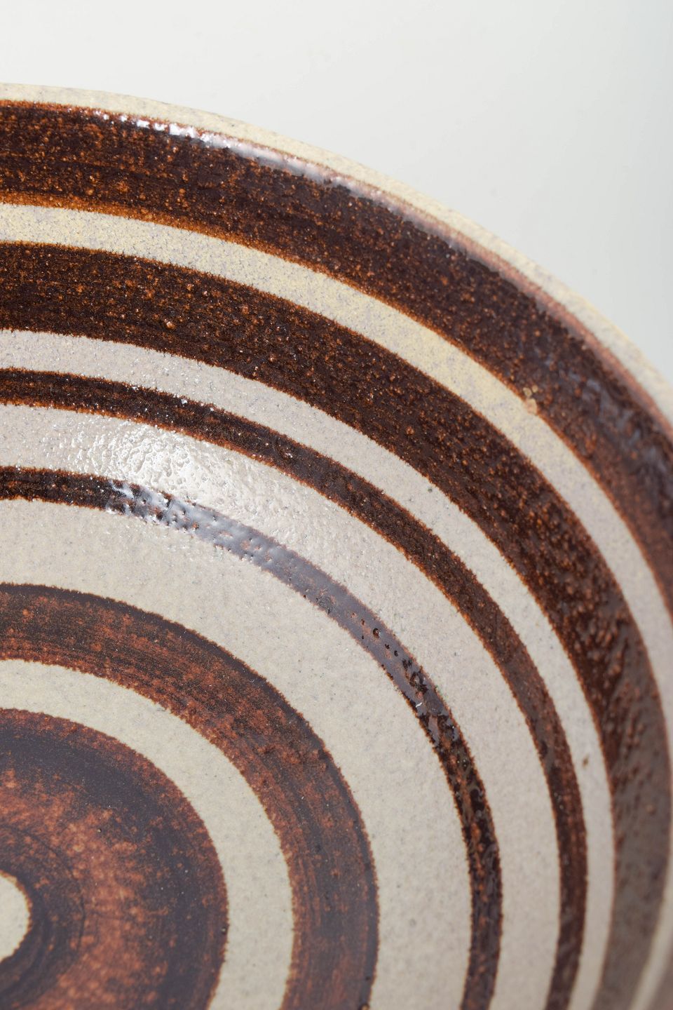 Deeper, wheel-thrown stoneware bowl with a dark brown glaze and an interior decoration of concentric light and brown rings. The bowl relates to the “Hambo” model and reflects a restrained, functional Nordic design language.
