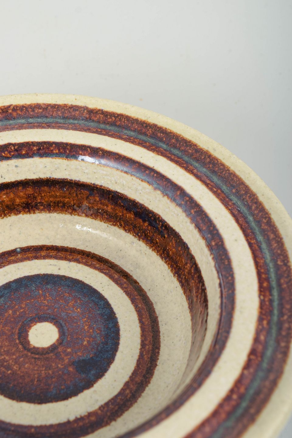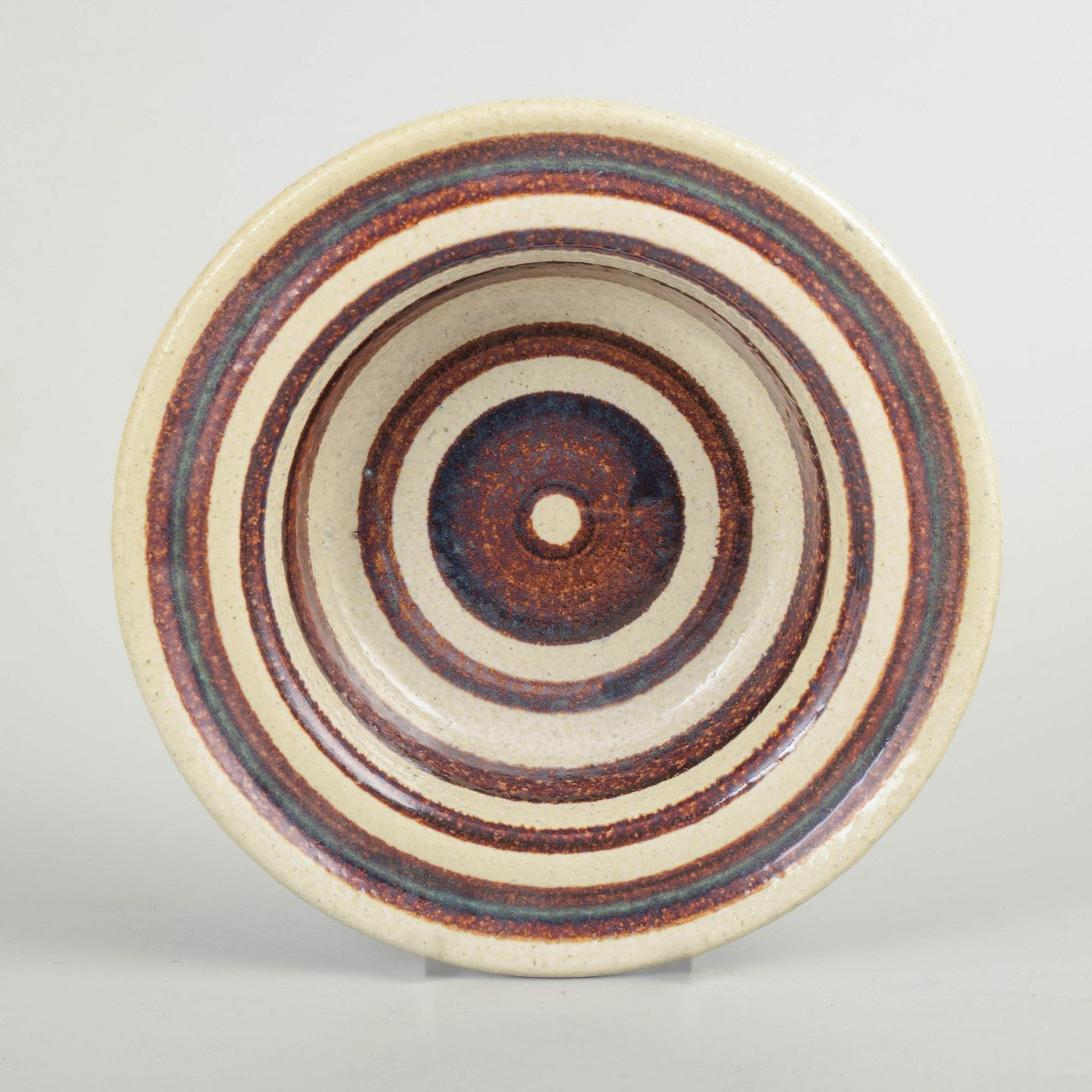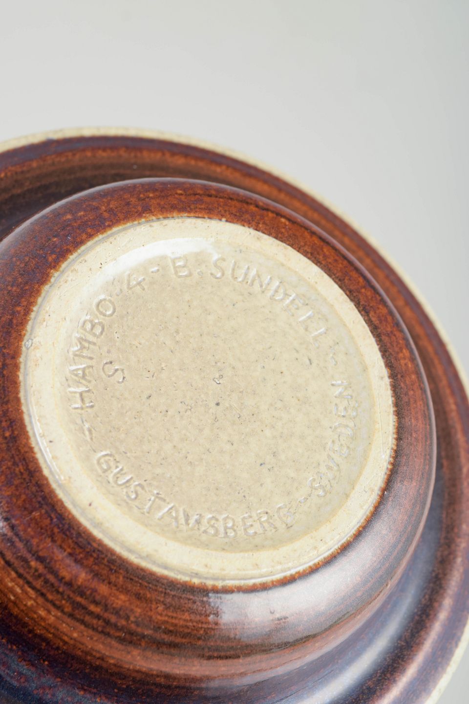 Britt Louise Sundell for Gustavsberg, stoneware bowl.Low, wheel-thrown stoneware bowl with a concentric ring decoration in brown and bluish tones on a light ground. The form and decoration relate to the “Hambo” model.