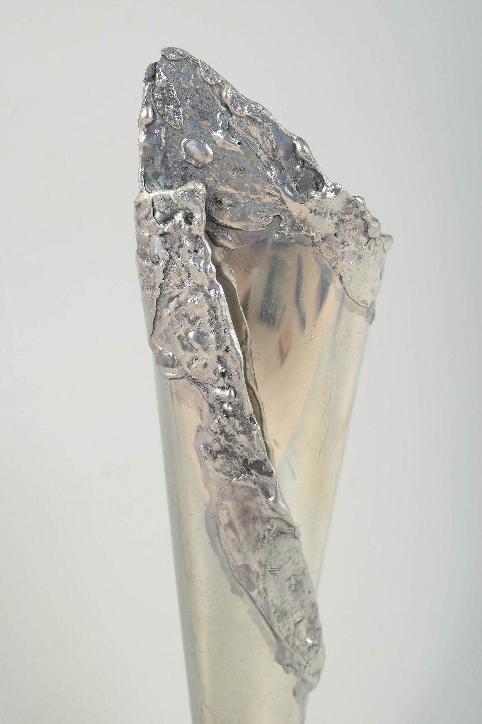 Bengt Berggren, large pewter vase in brutalist style, 1980s.Sculptural pewter vase with a tall conical body and a raw, organic rim featuring textured detailing. Set on a square base.