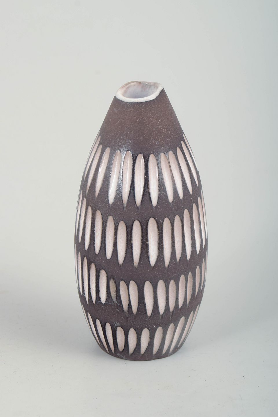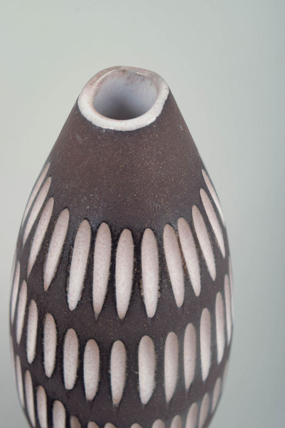Ingrid Atterberg for Upsala Ekeby, vase.Slender oval-shaped glazed ceramic vase with a tapering neck. The body is decorated with repeated vertical oval motifs in white against a dark brown ground glaze, creating a rhythmic and graphic expression characteristic of Scandinavian modernism. Model number 2131.