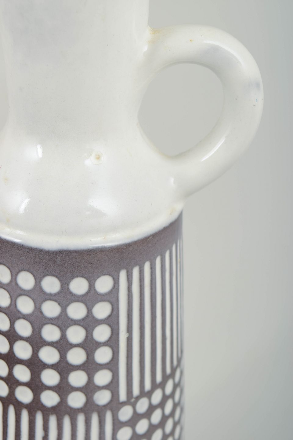 Tall, slender glazed ceramic pitcher with a narrow neck and single handle. The lower section is decorated with a strict graphic pattern of dots and vertical lines in white against a brown ground glaze, while the upper section is finished in white glaze. The rhythmic decoration gives the piece a clear modernist character. Model number 4564.