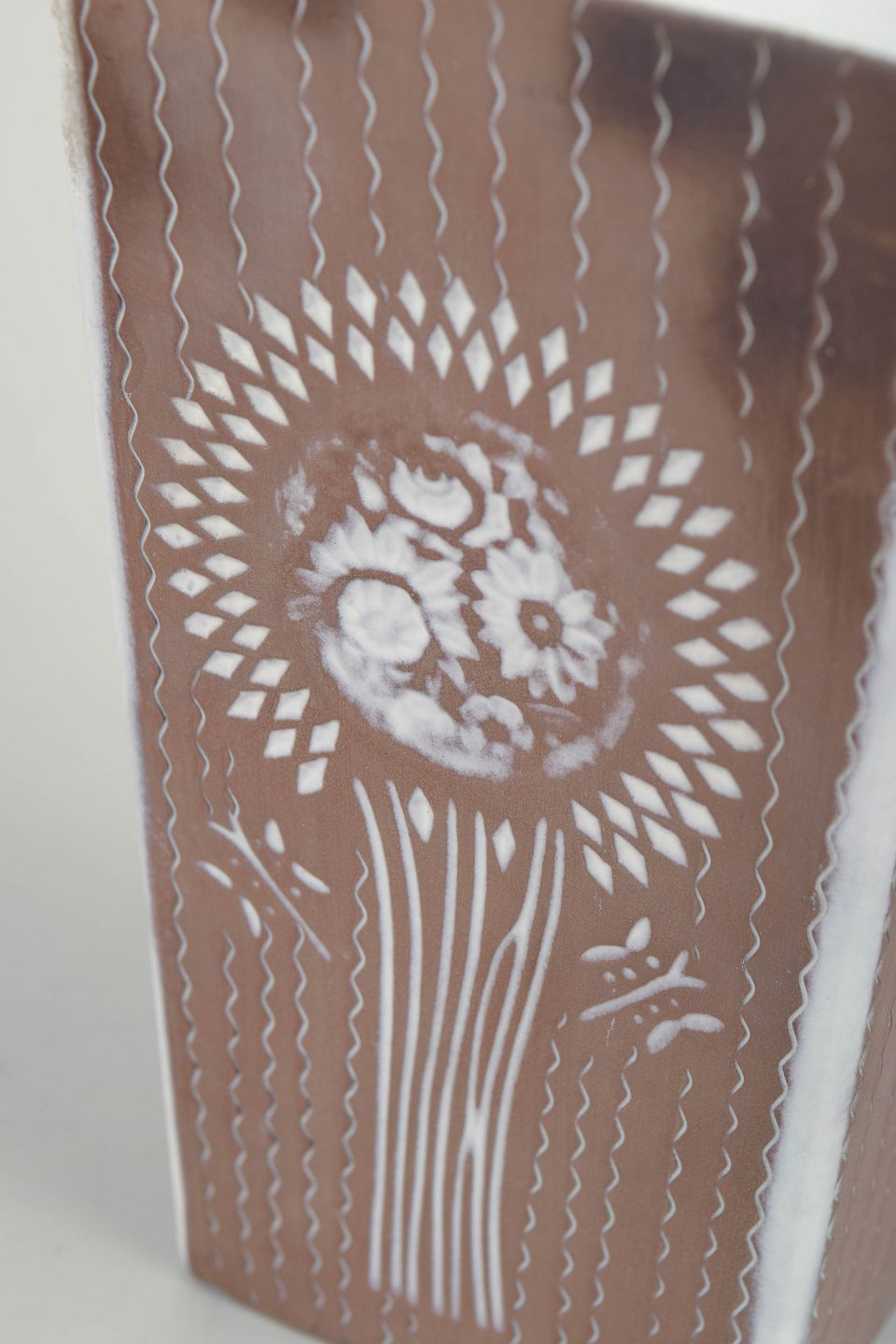 Mari Simmulson for Upsala Ekeby, vase.Faceted glazed ceramic vase with a square body and short neck. Decorated with stylised floral and radiating motifs in white against a brown ground glaze, executed in a graphic and symmetrical modernist idiom. Model number 43130/955.