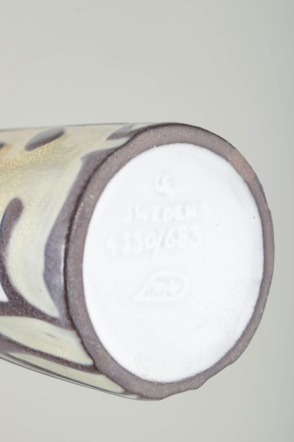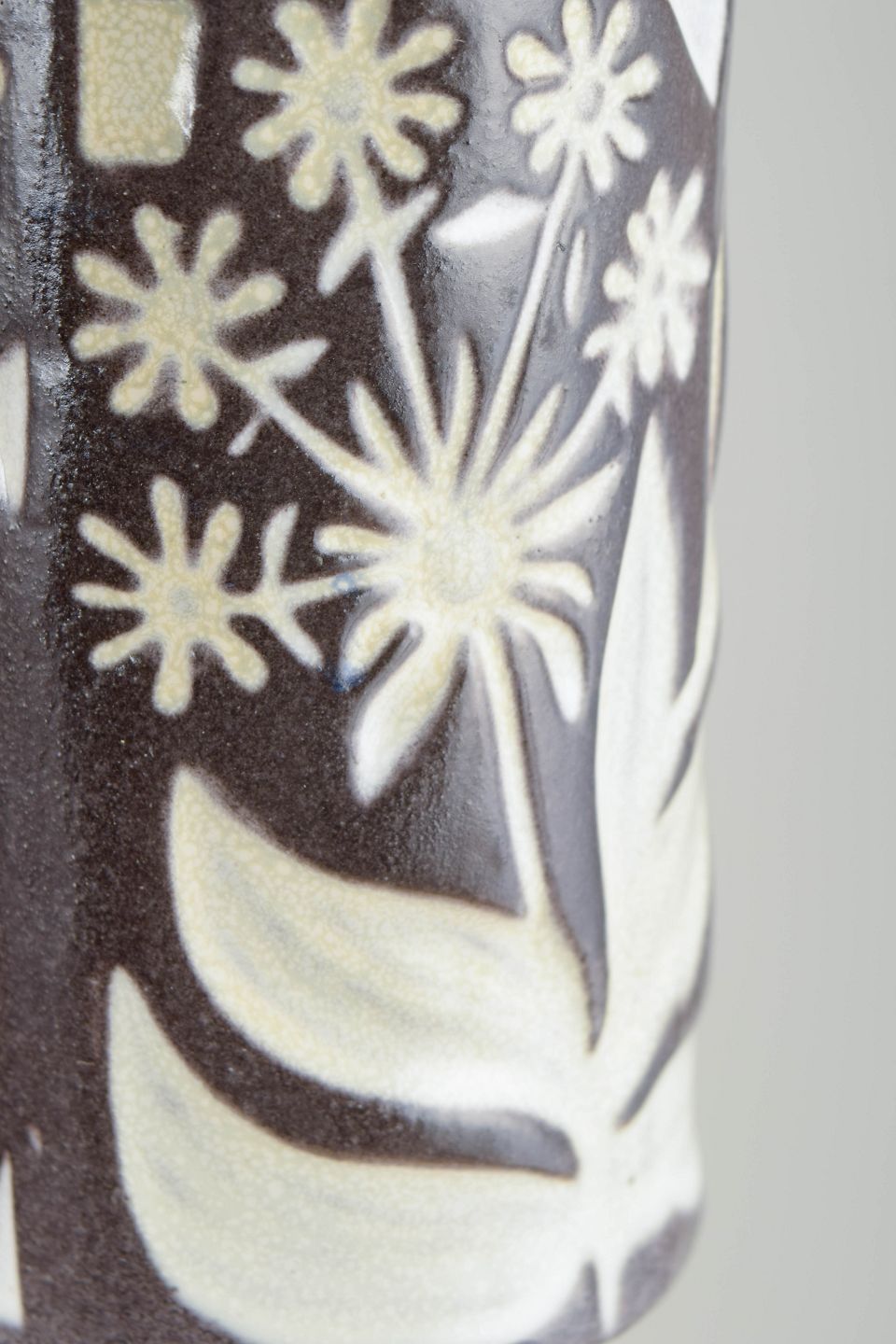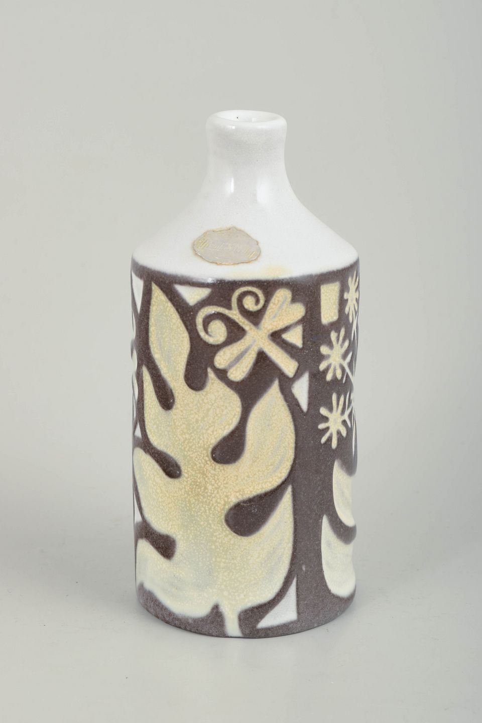 Mari Simmulson for Upsala Ekeby, vase.Cylindrical glazed ceramic vase with a narrow neck and graphic decoration in cream and brown tones against a white ground glaze. The design features stylised leaf motifs and ornamental elements with a clear modernist expression. Model number 4330/683.