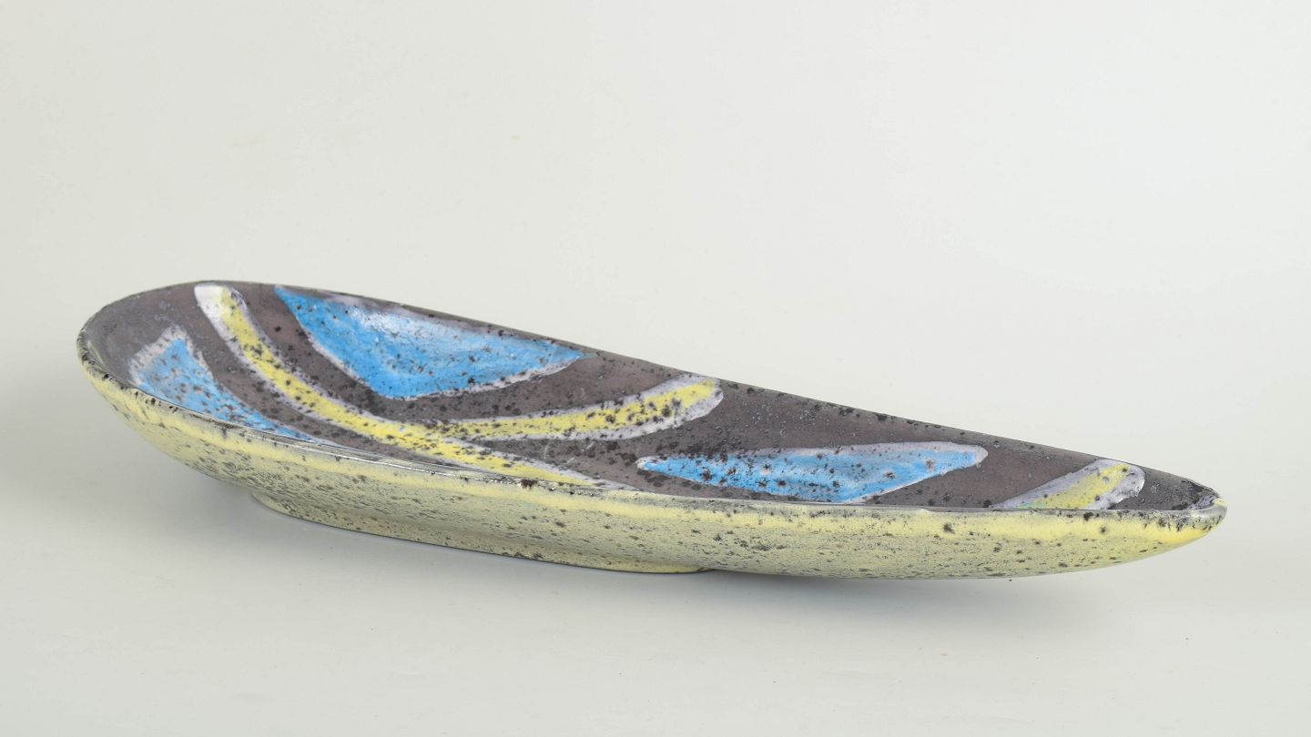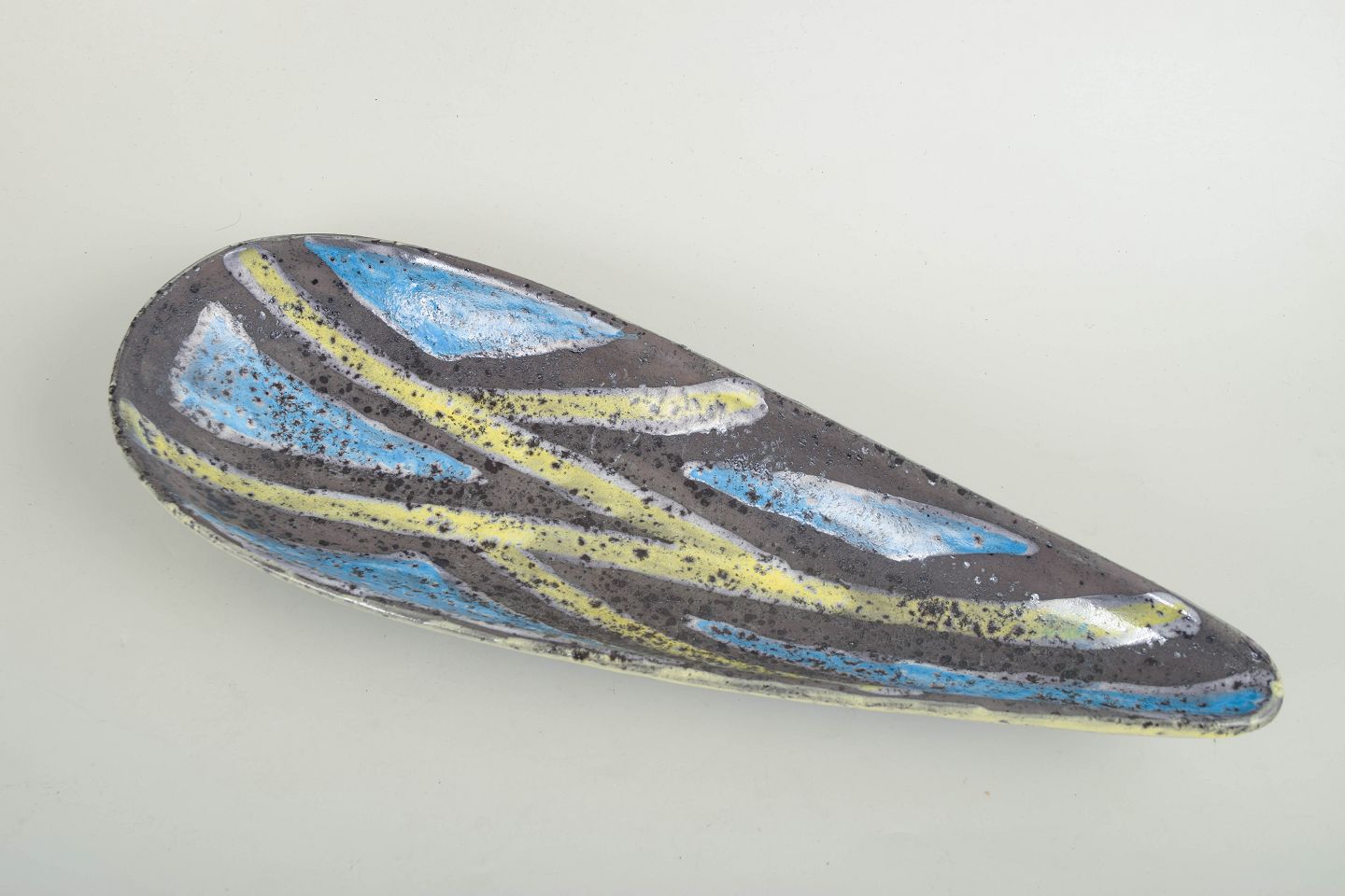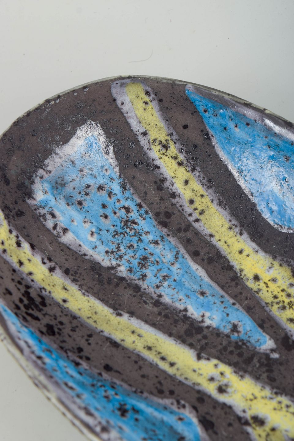 Guido Gambone for Bitossi, large oval bowl.Large, organically shaped oval bowl in glazed ceramic with an abstract, hand-decorated pattern in blue, yellow and dark tones, featuring a characteristic speckled/splashed glaze effect.