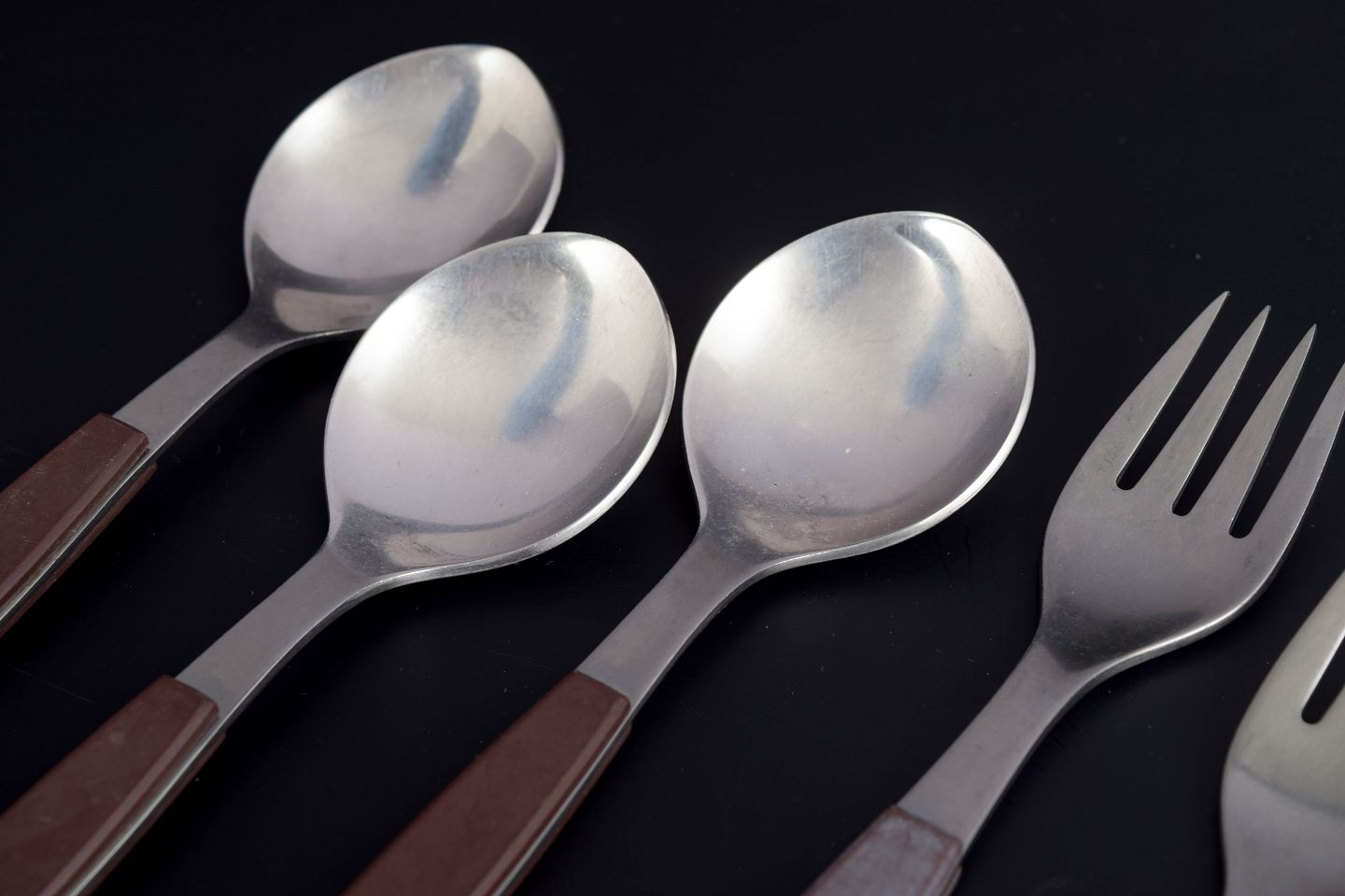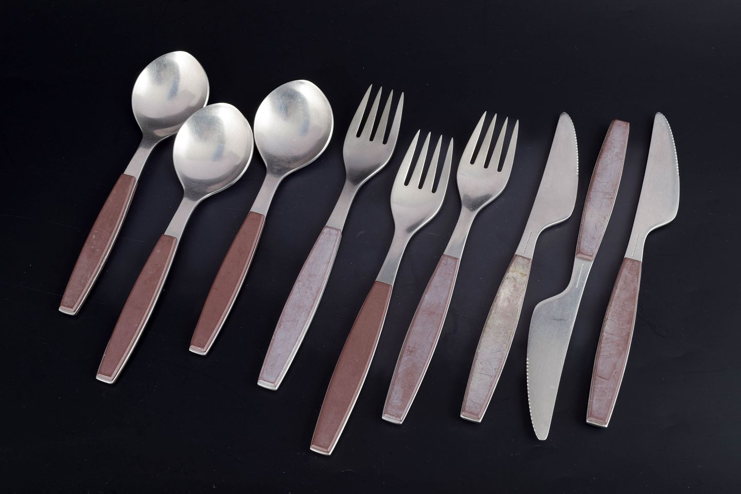 Set comprising three dinner knives, three dinner forks, and three table spoons in stainless steel with brown handles. The model is from the Strata series.