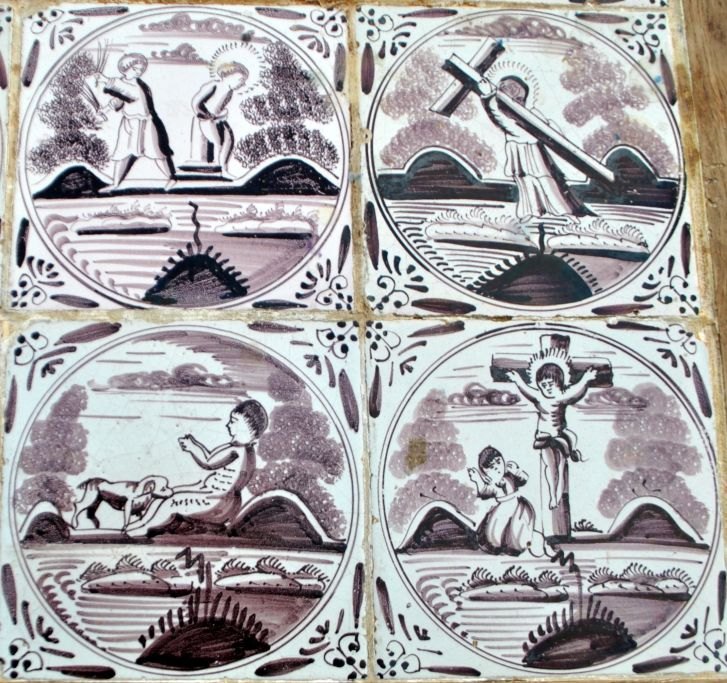 Original Danish tile table, Louis XVI, late 18th century. Oak with dentils and callouts on legs. Top in the form of 15 Dutch manganese-colored tiles from 1750 - 1775 with biblical motifs and ox-head corners. H.: 75 cm. L.: 76 cm. W.: 50 cm.Item number: 28800